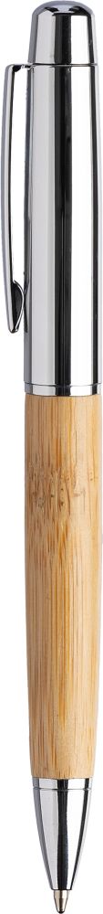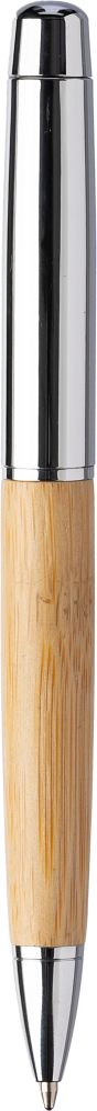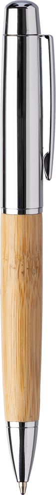 Stainless steel twist ballpen with bamboo grip in a bamboo and aluminum tube. Includes metal Parker blue refill. Individually packaged in a brown carton box.