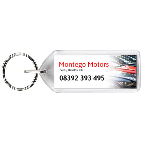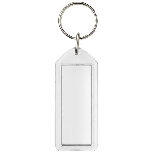 Clear rectangular F1 keychain with metal split keyring. This keychain is reopenable with a coin. The metal looped ring offers a flat profile which is ideal for mailings. Print insert dimensions: 5,0 cm x 2,0 cm.