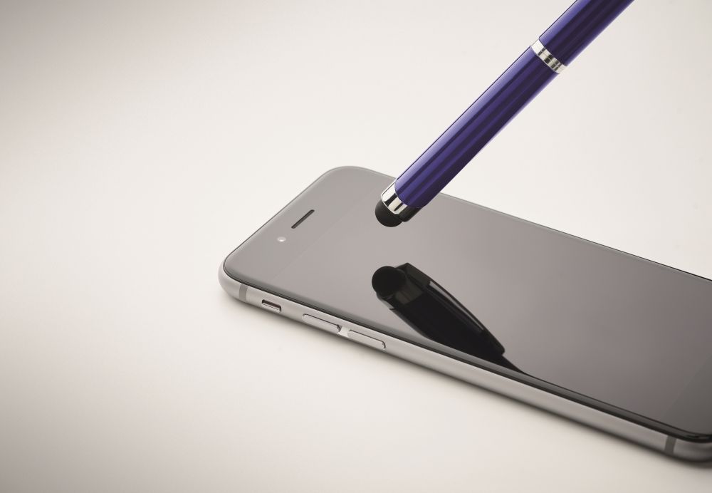 Twist action ball pen in recycled aluminium with stylus. Blue ink.