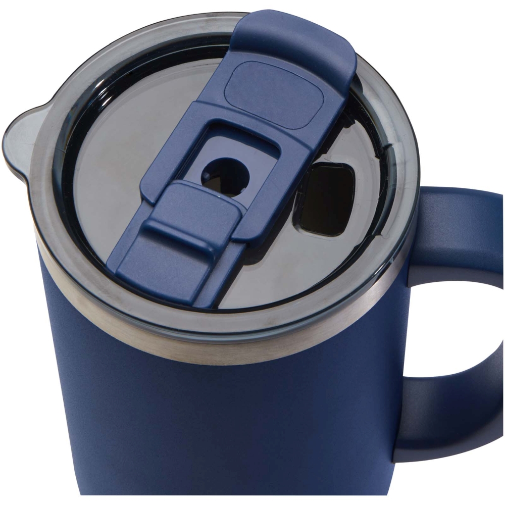 RCS certified double walled copper vacuum insulated tumbler, constructed using 91% post-consumer recycled stainless steel that will keep drinks cold for at least 24 hours, or hot for 9 hours. Features a Tritan straw, and a lid slider function to prevent spills. The 100% recycled plastic press-on swivel lid securely holds the straw in place, and can easily be rotated to expose the drink opening. Durable exterior powder coating. Volume capacity: 1200 ml. Hand wash only. Dimensions: 14 x 26,5 x 7,5 x O 10 cm