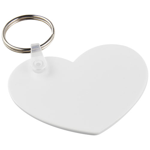White heart-shaped keychain with metal split keyring. The metal looped ring offers a flat profile which is ideal for mailings.