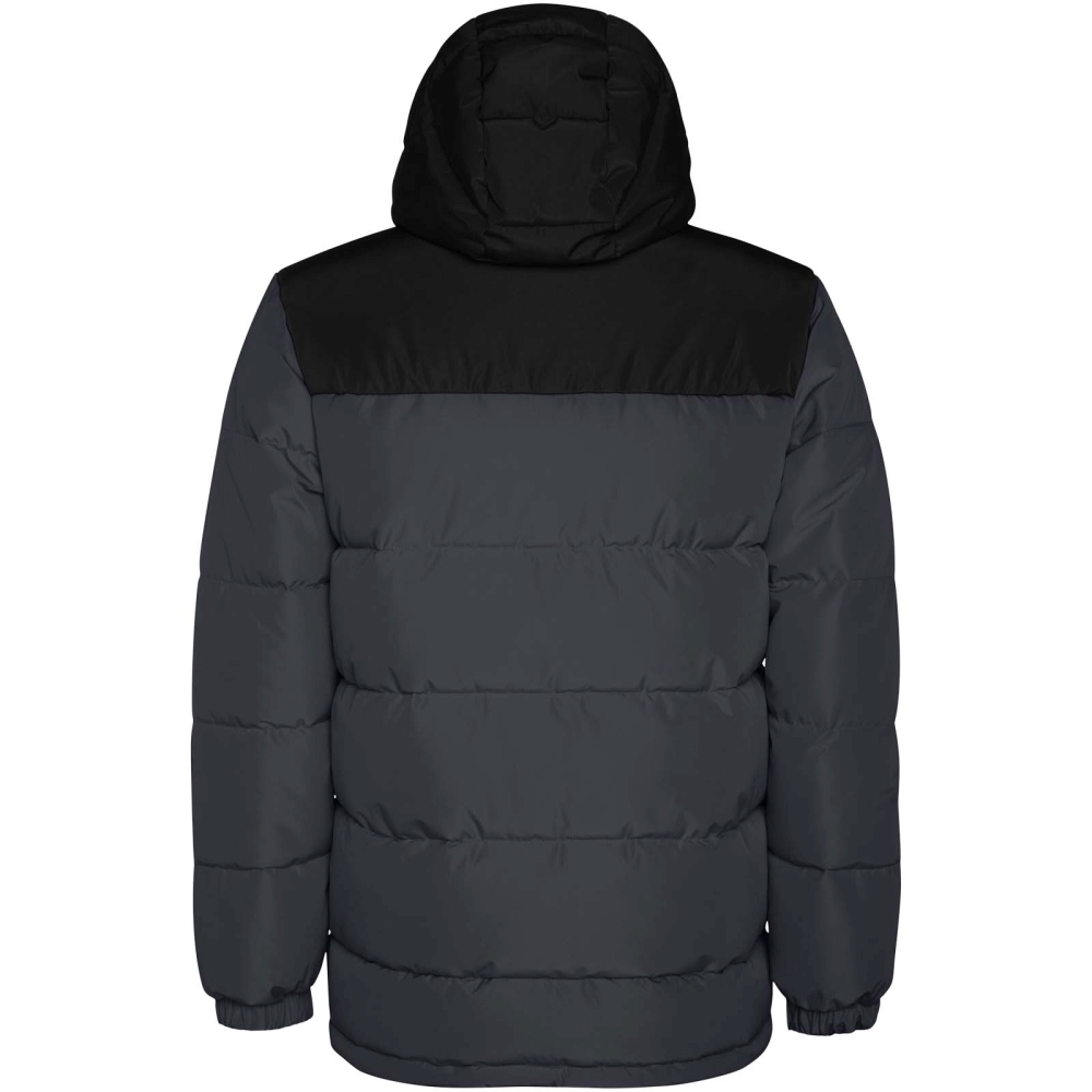 Padded jacket with fixed hood. Front zipper covered with a placket. Chin guard. Two side pockets with zip. Elastic cuffs.
