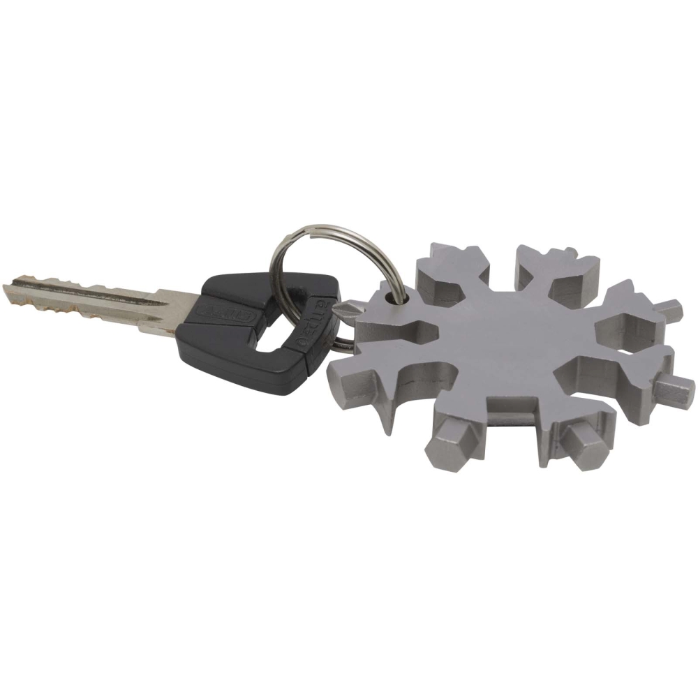 A robust and compact 8-function multitool made from stainless steel that you can carry with you on your keys. Dimensions: 6,3 x 6,3 cm
