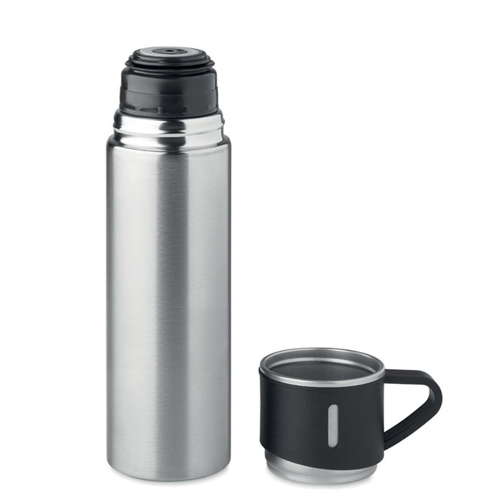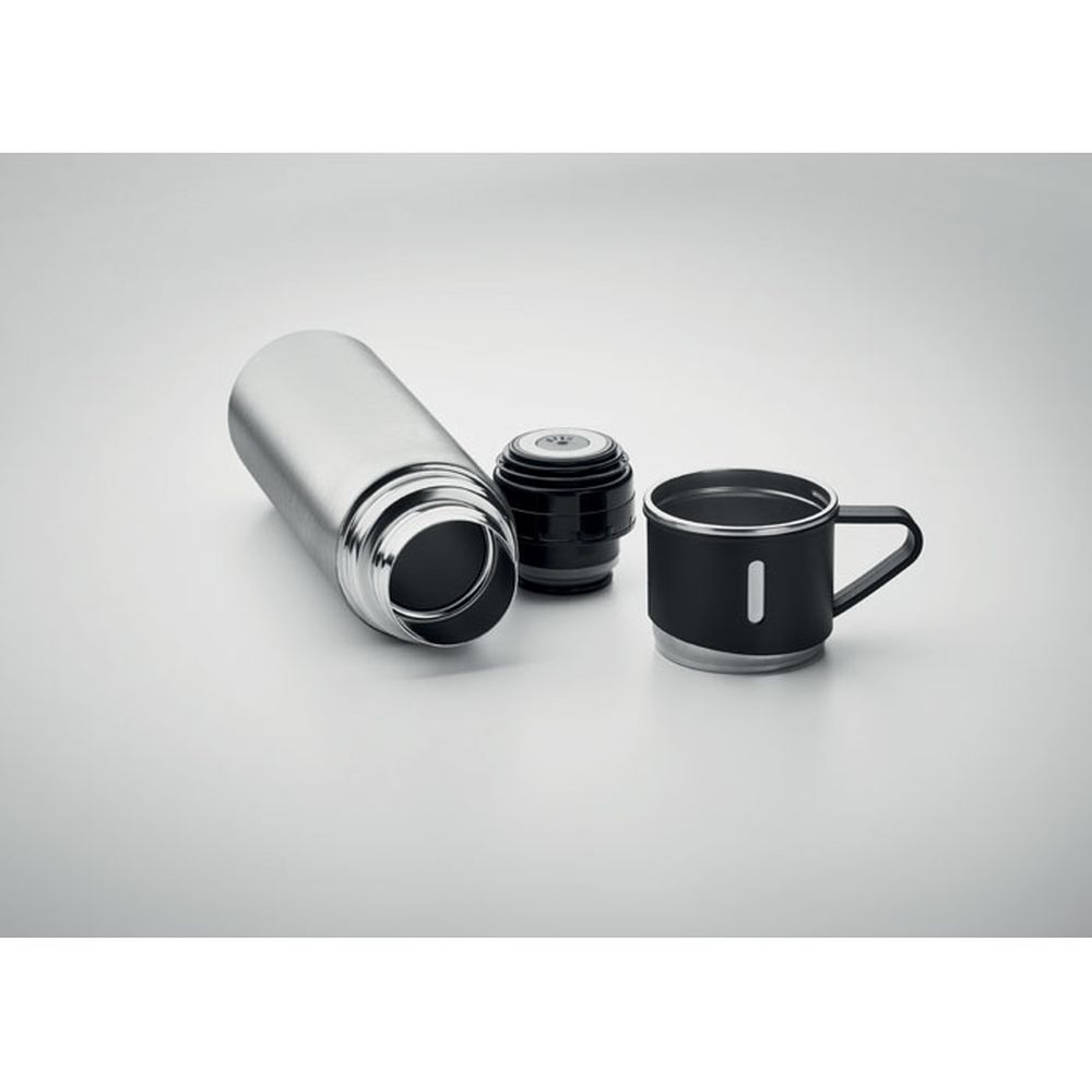 Double wall stainless steel vacuum insulated flask with leak-free cup lid. Capacity: flask 420 ml, cup 150 ml., dimension: O 6x 22,5 cm.