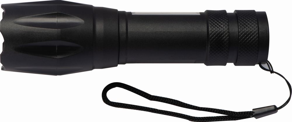 Rechargeable torch (3W, 150 lumens) with 600mAh battery and additional side light (3W, 130 lumens). The torch has three light modes and is supplied with a charging cable. Your logo will be engraved on the torch.