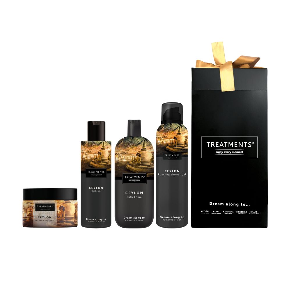 Let the stress of the day melt away as you step into the bath and dream with the delightful Ceylon scents from the exclusive Treatments® Giftbox Bath Experience. This luxurious box contains everything you need for an unforgettable bath experience. Immerse yourself in the luxury of our Bath Foam for rich lather or choose the nourishing Bath Oil for silky-soft skin. Cleaning is effortless with the Foaming Shower Gel, and the exfoliating Sea Salt Body Scrub provides a refreshing boost for your skin. Dimensions: 14 x 14 x 28 cm