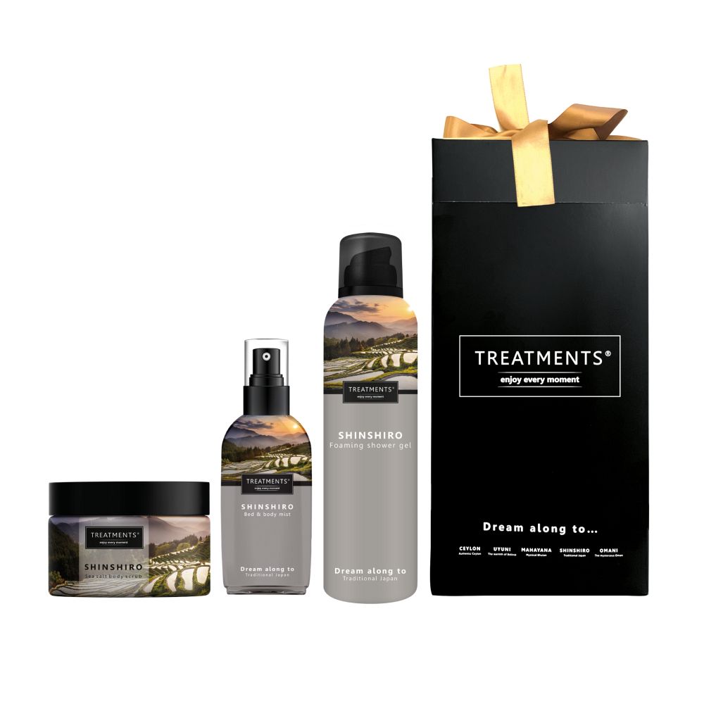 The Treatments® Giftbox Body & Scrub - Shinshiro brings the luxury of a spa to the blissful comfort of your own bathroom. This elegant gift set in the Shinshiro fragrance line is the perfect present for anyone who loves wellness and self-care. Enjoy the rich, silky foam of the Foaming Shower Gel, invigorate your senses with the exfoliating Sea Salt Body Scrub for a velvety-soft skin, and let the Bed & Body Mist subtly scent your skin and clothing all day long. Dimensions: 14 x 14 x 28 cm