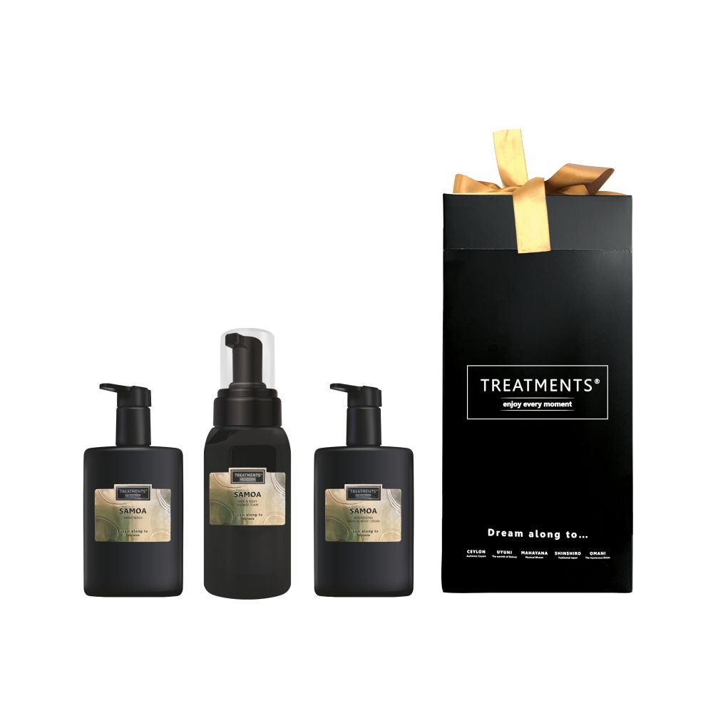 Cleanse and care for your skin and hair from head to toe with the Treatments® Giftbox Experience Deluxe in the Samoa fragrance line. This luxurious gift set includes a Hair & Body Shower Foam to gently cleanse both skin and hair, an ultra-soft Hand Wash, and a Nourishing Hand & Body Cream that leaves the skin feeling wonderfully soft. Dimensions: 14 x 14 x 28 cm