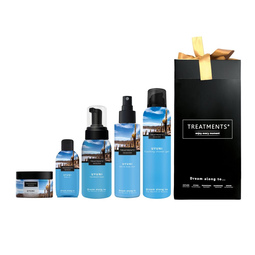 The Treatments® Giftbox Large is an incredible combination of luxury and relaxation. This Uyuni box includes everything you need for a pampering experience: a gentle Foaming Shower Gel for a refreshing shower, a soothing Bed & Body Mist for a calming atmosphere, and a Sea Salt Body Scrub that exfoliates the skin to a silky-soft finish. The Hand Wash Foam provides a velvety soft cleanse for your hands, while the nourishing Body Oil leaves the skin feeling smooth and hydrated. The Giftbox Large is the perfect gift for those who love luxury, self-care, and tranquility. Dimensions: 14 x 14 x 28 cm
