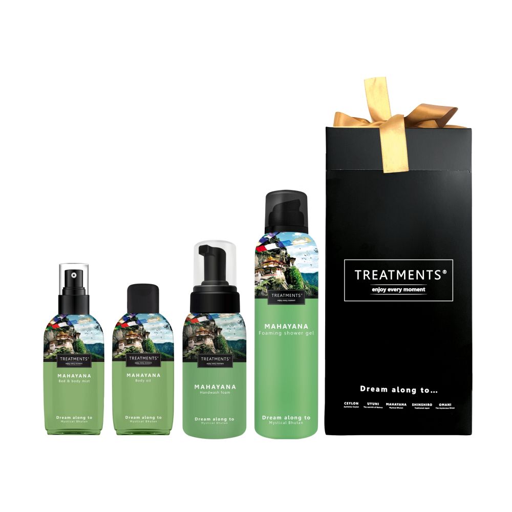 Relax, indulge, and experience the luxury of Treatments®! Treat yourself or someone special with this beautiful Giftbox Medium, ensuring your favorite fragrance subtly lingers all day long. This stunning box contains everything you need for a complete pampering experience: a refreshing Mahayana Foaming Shower Gel, a gentle and cleansing Hand Wash Foam, a revitalizing Bed & Body Mist, and nourishing and soothing Body Oil. The perfect gift for any occasion, offering a wonderful moment of indulgence and tranquility! Dimensions: 14 x 14 x 28 cm