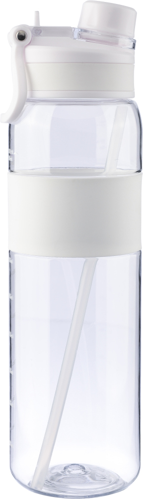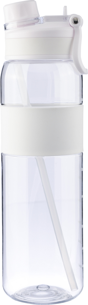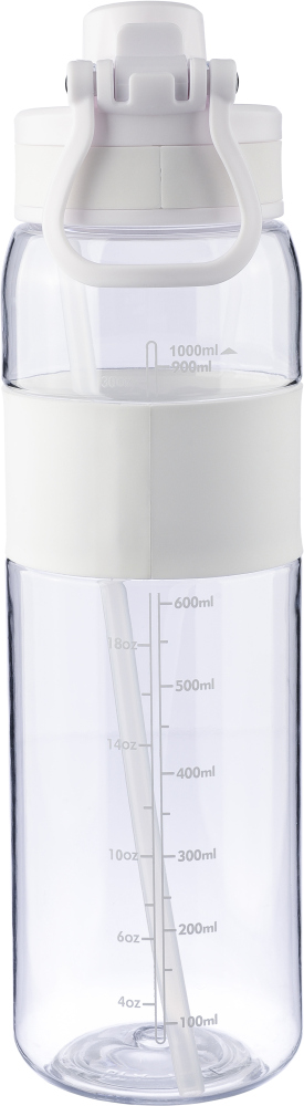 Tritan drinking bottle (900 ml) with two drinking options: a twist-close opening and a foldable straw with internal tube. Features a silicone grip, PP carrying handle, and printed capacity indicator. Screw lid. Packed in eggcrate. Dimensions: 7,6 x 27,8 cm
