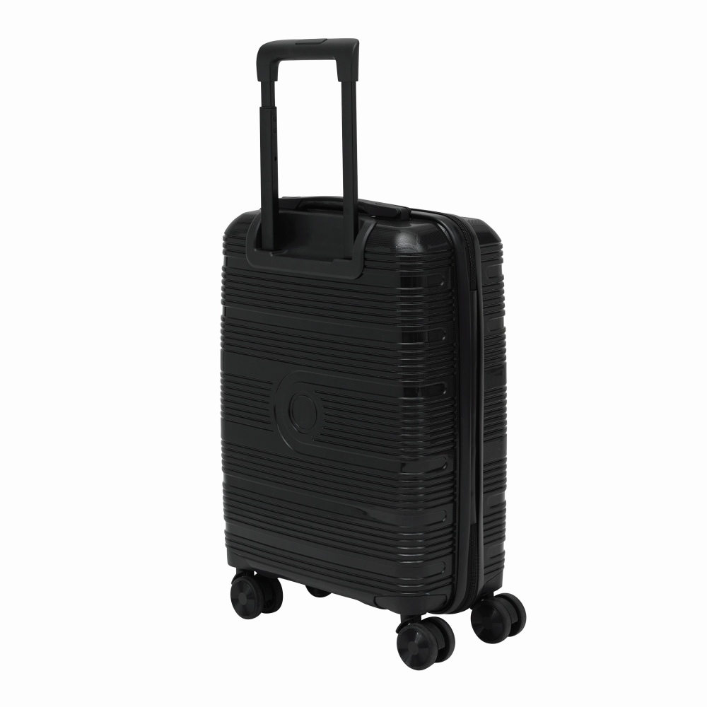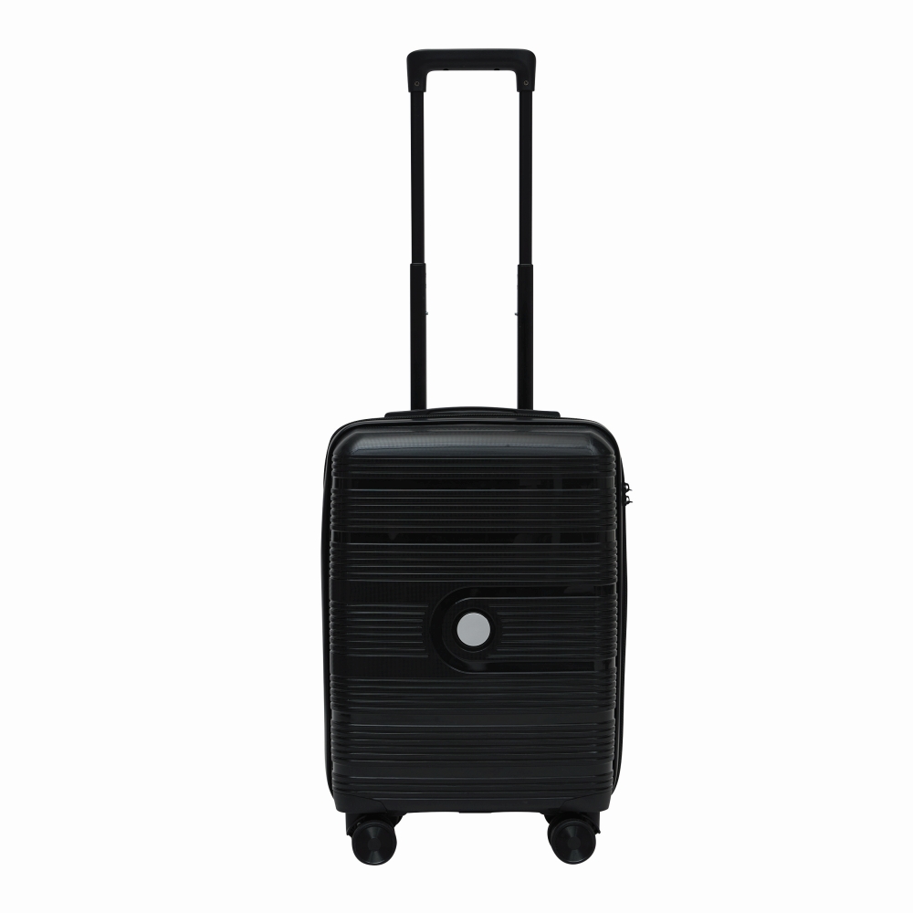 Cabin rolling suitcase made of extra durable material, packing on both levels, with zipper mesh pocket and elastic packing strap, telescopic handle with lockable position for walking, carrying handle, 4 double wheels with smooth running 360°, replaceable metal label with logo on the front, combination lock; size corresponding to dimensions for cabin luggage of low-cost airlines. Dimensions: approx. 55 x 37 x 20 cm