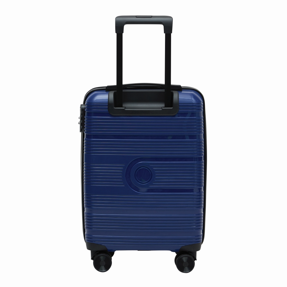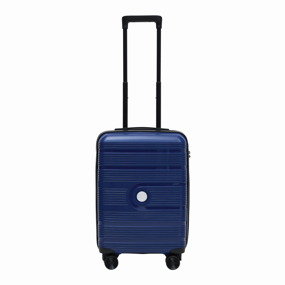 Cabin rolling suitcase made of extra durable material, packing on both levels, with zipper mesh pocket and elastic packing strap, telescopic handle with lockable position for walking, carrying handle, 4 double wheels with smooth running 360°, replaceable metal label with logo on the front, combination lock; size corresponding to dimensions for cabin luggage of low-cost airlines. Dimensions: approx. 55 x 37 x 20 cm