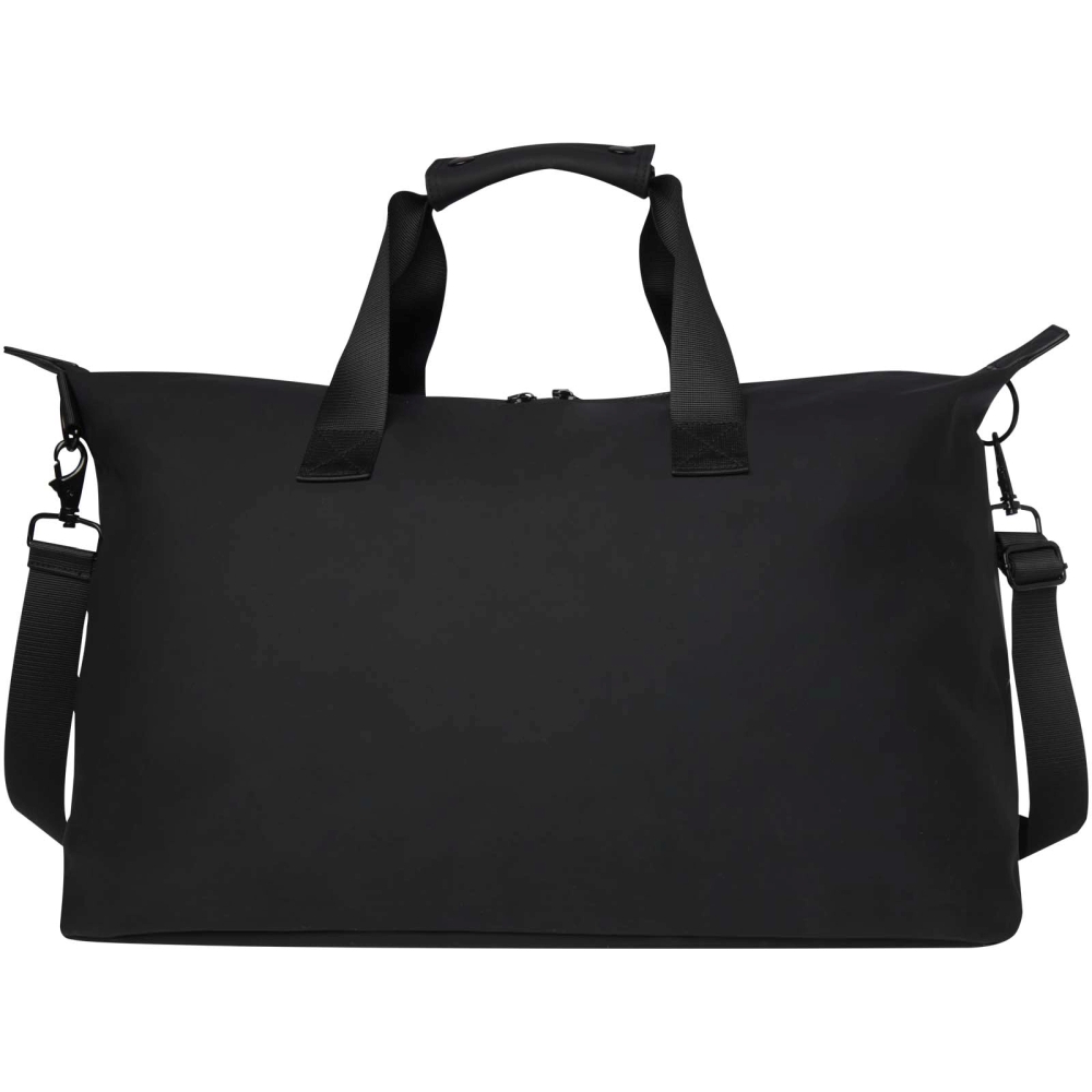 The Turner duffel bag is made of 51% GRS certified recycled plastic and the lining is made of 100% GRS certified RPET. The duffel features a padded 15.6" laptop compartment, an internal strap for securing a water bottle, and a zipped pocket for smaller items. Additionally, a luggage strap on the back allows for easy attachment to rolling luggage, making it a convenient travel companion. The duffel can be carried by the 2 short handles, or by the expandable and detachable shoulder strap that can be adjusted for maximum comfort. Volume capacity: 36 litres. Dimensions: 52 x 27 x 29 cm