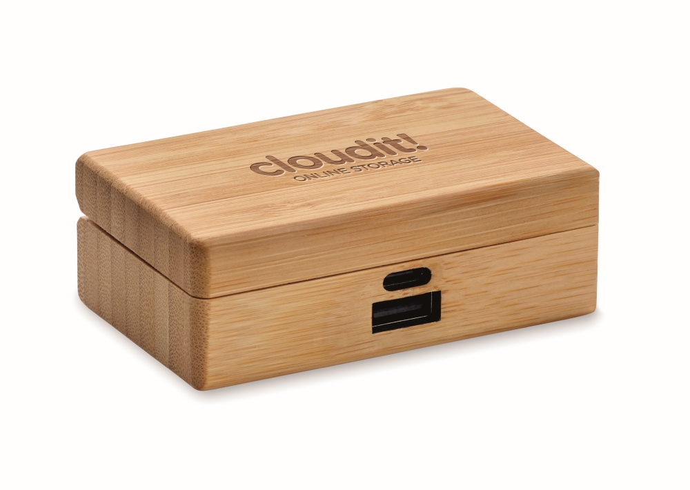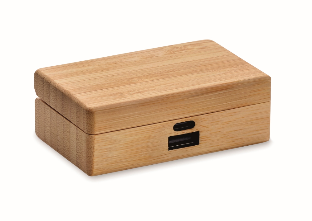 TWS earbuds with microphone in bamboo case. Includes 1200 mAh emergency power bank with type-C input and type-A output. Auto-pairing. Dimensions: 8,1 x 5,2 x 2,7 cm
