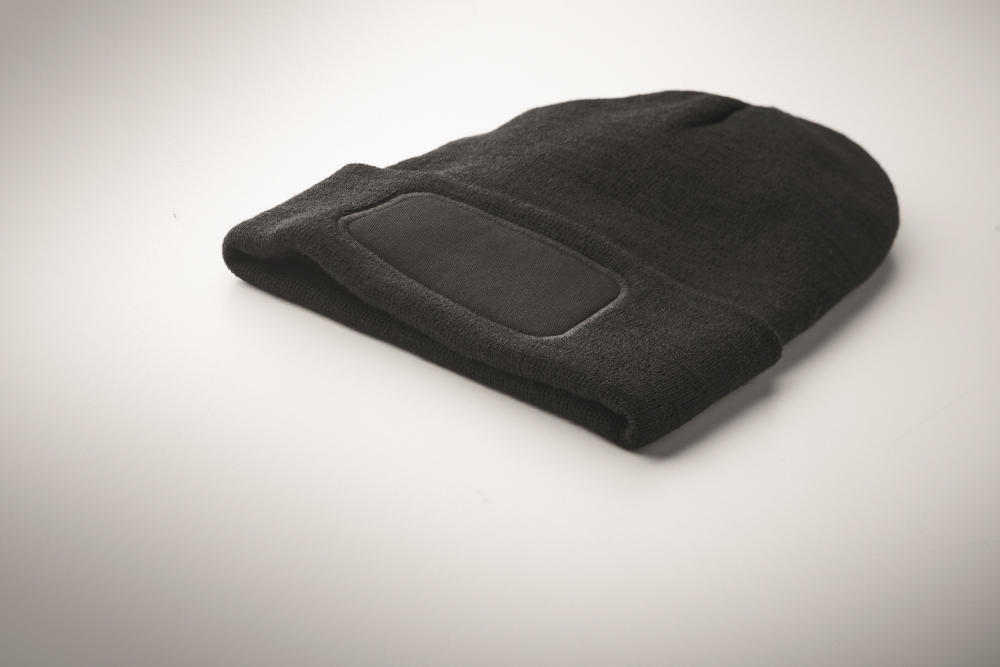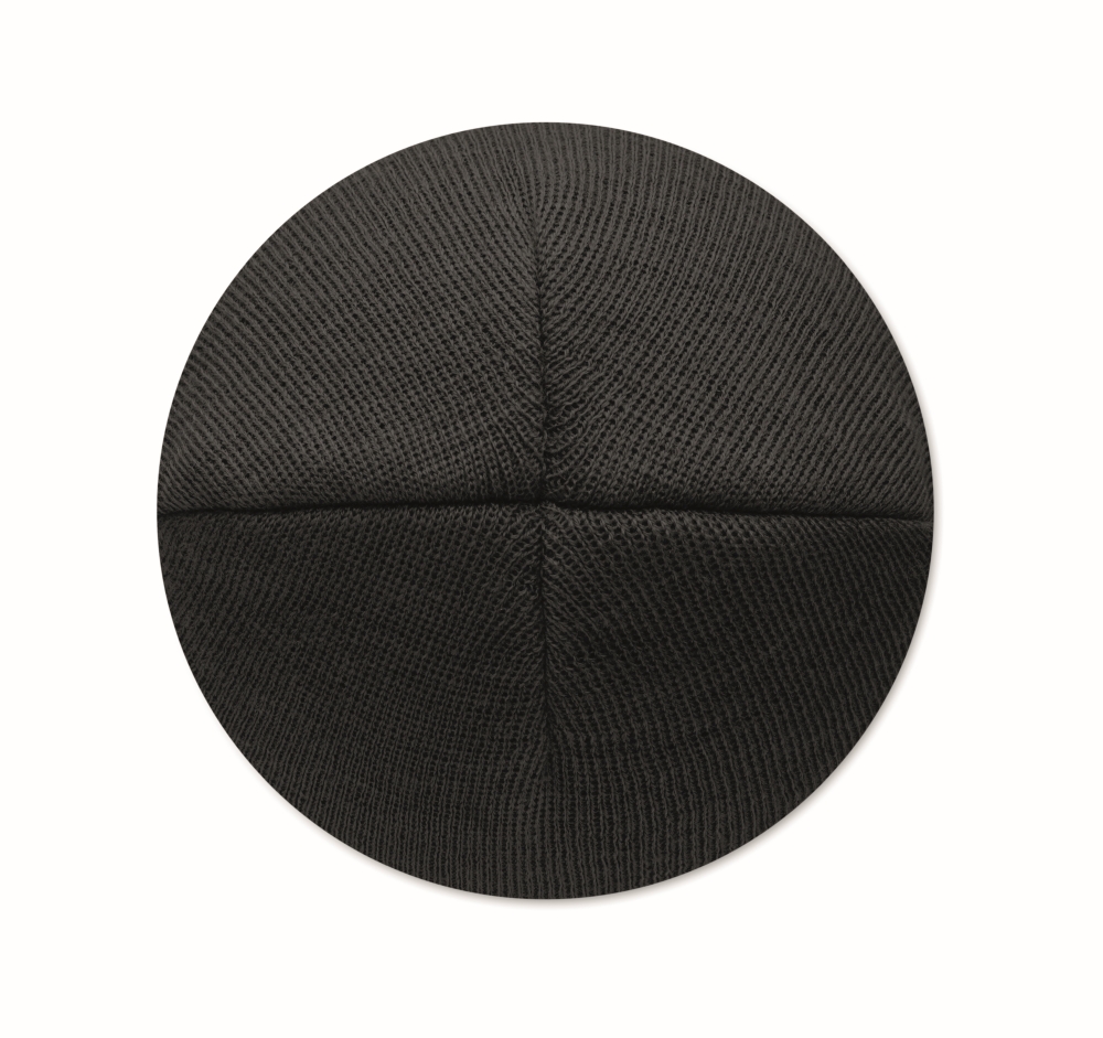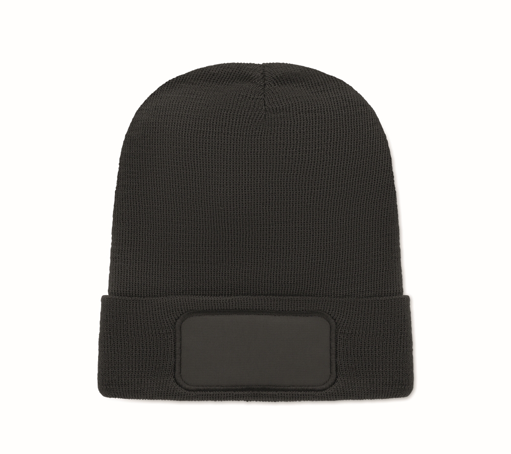Unisex knitted beanie in soft stretchable RPET polyester with cuff and patch. Dimensions: O 21 x 23 cm