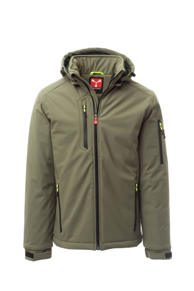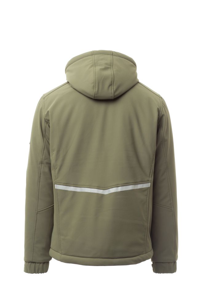 WP 8000 mm H2O, WVT 5000 g/m2 24h. Men’s padded soft-shell, SBS zip closure with "semi-auto lock" metal slider and customised pull. Adjustable and detachable hood with drawstring. Inner collar with polar fleece side details. Retroreflective strips on the lower back and back of the hood. Elasticated cuffs, adjustable with Velcro. Two side pockets with zip fastening, a breast pocket with coated zip and a pocket on the left arm with integrated pen holder, closed with a zip. Fluorescent pullers. One internal welt pocket, closed with Velcro. Adjustable bottom with customised stoppers.