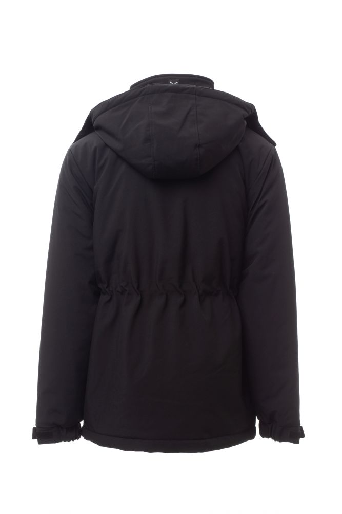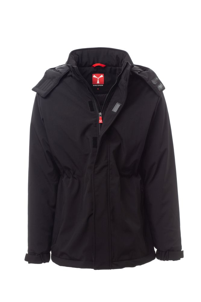 WP 8000 mm H2O, WVT 5000 g/m2 24h. Men’s padded soft-shell, with Velcro closure and zip with "semi-auto lock" metal slider and customised pull. Detachable hood, closable on the front with Velcro. Drawstring waist, two external pockets with coated zip, one internal welt pocket with Velcro fastening, one internal tablet holder pocket with Velcro fastening. Elasticated cuffs, adjustable with Velcro. Customised patch on the back of the neck, with retroreflective detail.