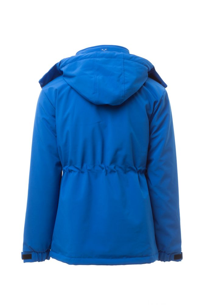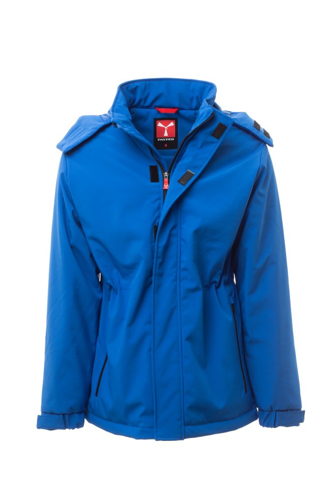 WP 8000 mm H2O, WVT 5000 g/m2 24h. Men’s padded soft-shell, with Velcro closure and zip with "semi-auto lock" metal slider and customised pull. Detachable hood, closable on the front with Velcro. Drawstring waist, two external pockets with coated zip, one internal welt pocket with Velcro fastening, one internal tablet holder pocket with Velcro fastening. Elasticated cuffs, adjustable with Velcro. Customised patch on the back of the neck, with retroreflective detail.