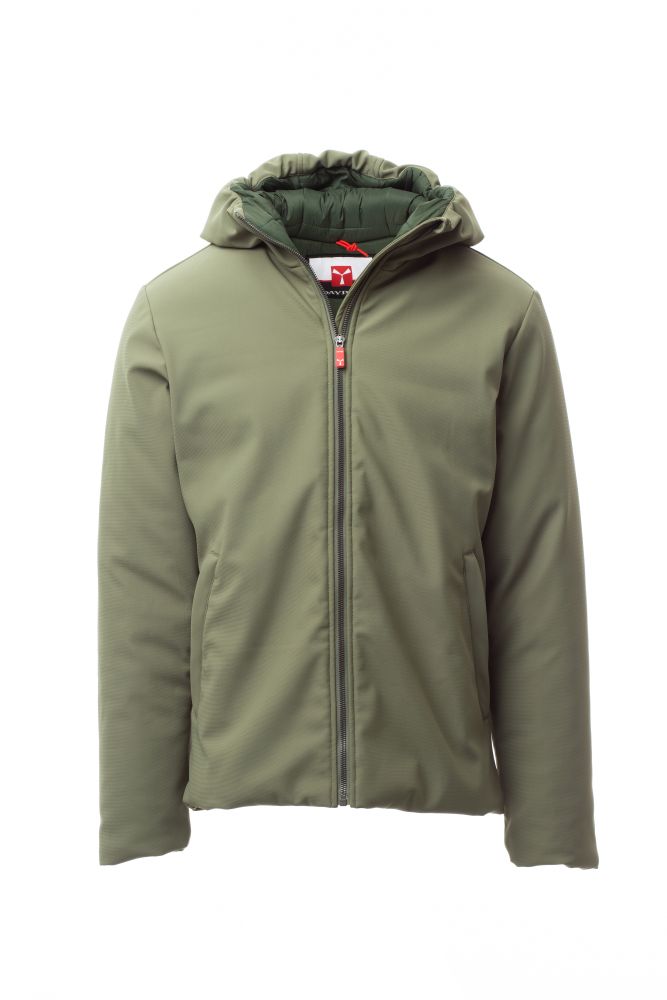 WP 8000 mm H2O, WVT 3000 g/m2 24h. Men’s padded soft-shell jacket with hood, full SBS plastic zip with metal “semi-auto lock” pull, two external zipped pockets, one internal zipped pocket.