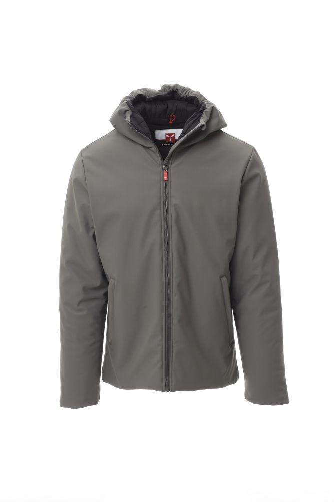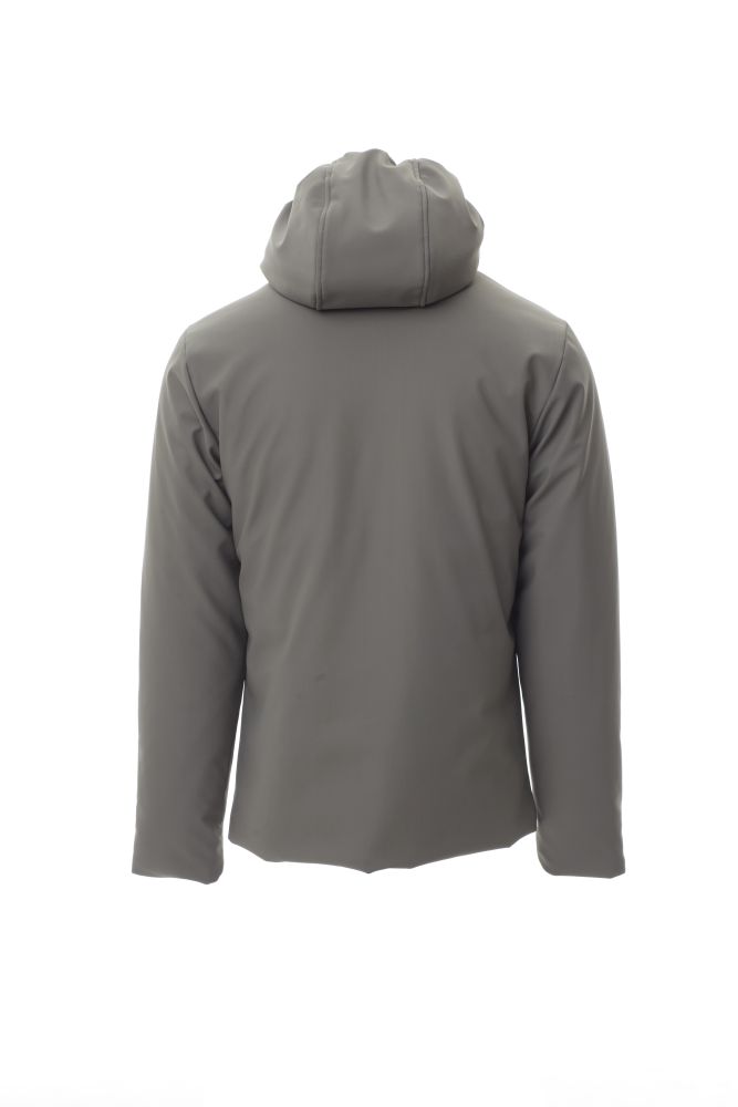 WP 8000 mm H2O, WVT 3000 g/m2 24h. Men’s padded soft-shell jacket with hood, full SBS plastic zip with metal “semi-auto lock” pull, two external zipped pockets, one internal zipped pocket.