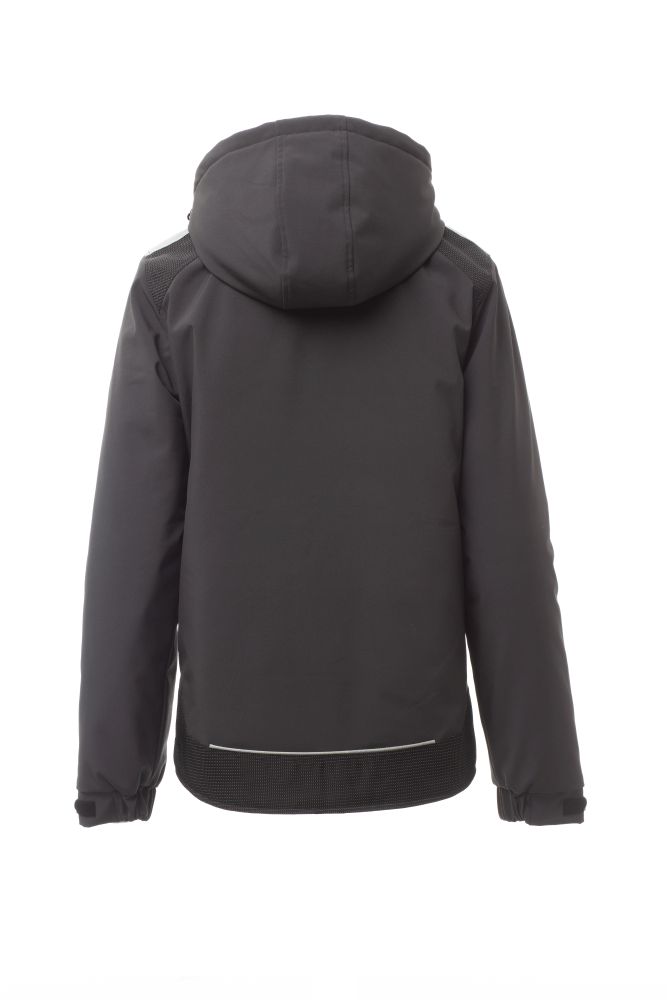 WP 8000 mm H2O, WVT 5000 g/m2 24h Men’s padded soft-shell, zip closure with "semi-auto lock" metal slider and customised pull. Adjustable and detachable hood with drawstring. Retroreflective strip on shoulders. Elasticated cuffs, adjustable with Velcro. Lock System breast pocket with flap and pen holder. Two side pockets closed with zip. Two internal pockets, one tablet holder pocket closed with Velcro and one shaped breast pocket with zip on the right. Adjustable bottom with customised stoppers and reflective piping on the back.
