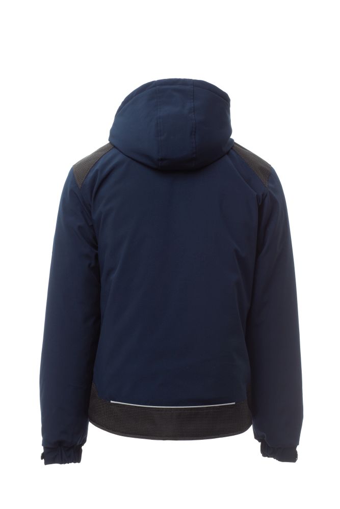 WP 8000 mm H2O, WVT 5000 g/m2 24h Men’s padded soft-shell, zip closure with "semi-auto lock" metal slider and customised pull. Adjustable and detachable hood with drawstring. Retroreflective strip on shoulders. Elasticated cuffs, adjustable with Velcro. Lock System breast pocket with flap and pen holder. Two side pockets closed with zip. Two internal pockets, one tablet holder pocket closed with Velcro and one shaped breast pocket with zip on the right. Adjustable bottom with customised stoppers and reflective piping on the back.