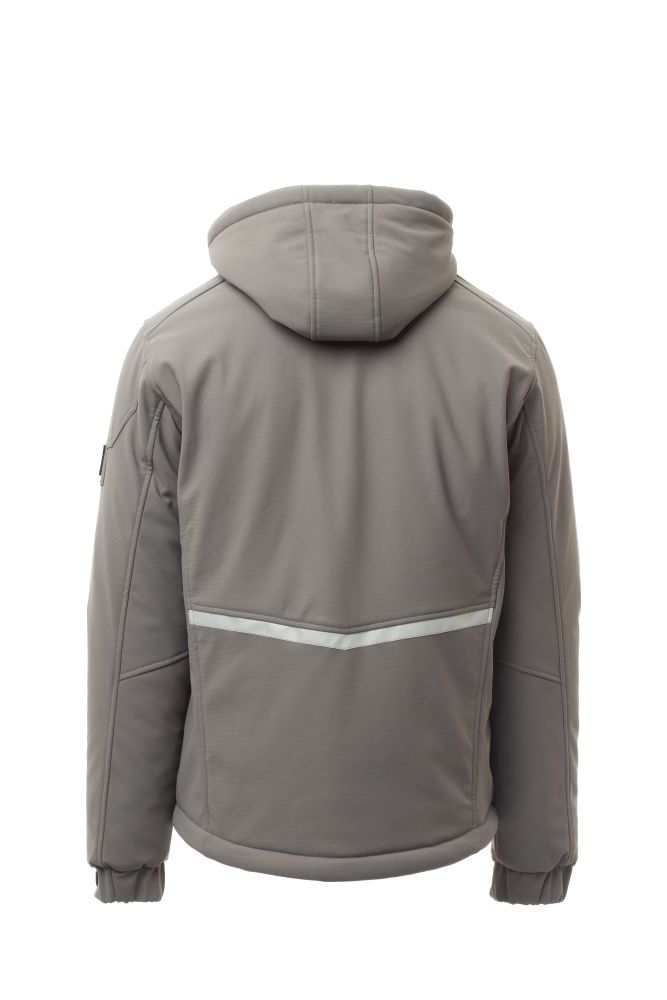 WP 8000 mm H2O, WVT 5000 g/m2 24h. Men’s padded soft-shell, SBS zip closure with "semi-auto lock" metal slider and customised pull. Adjustable and detachable hood with drawstring. Inner collar with polar fleece side details. Retroreflective strips on shoulders, lower back and back of the hood. Elasticated cuffs, adjustable with Velcro and inner sleeve. Heat-sealed breast pocket, closed with coated zip. Two side pockets, closed with a zip with a retro-reflective detail. Left arm pocket with integrated pen holder, closed with a zip. Fluorescent pullers. Two inside pockets, one shaped breast pocket with zip on the right and one tablet holder closed with Velcro. Adjustable bottom with customised stoppers.