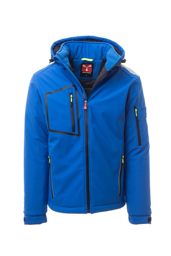 WP 8000 mm H2O, WVT 5000 g/m2 24h. Men’s padded soft-shell, SBS zip closure with "semi-auto lock" metal slider and customised pull. Adjustable and detachable hood with drawstring. Inner collar with polar fleece side details. Retroreflective strips on shoulders, lower back and back of the hood. Elasticated cuffs, adjustable with Velcro and inner sleeve. Heat-sealed breast pocket, closed with coated zip. Two side pockets, closed with a zip with a retro-reflective detail. Left arm pocket with integrated pen holder, closed with a zip. Fluorescent pullers. Two inside pockets, one shaped breast pocket with zip on the right and one tablet holder closed with Velcro. Adjustable bottom with customised stoppers.