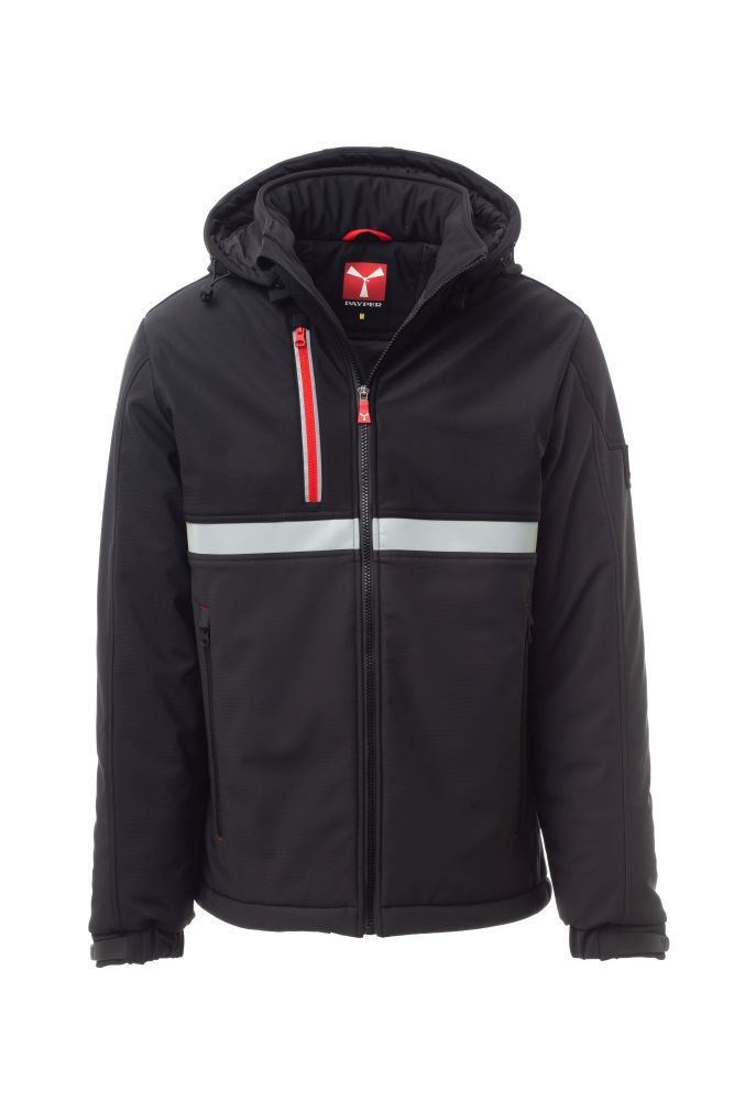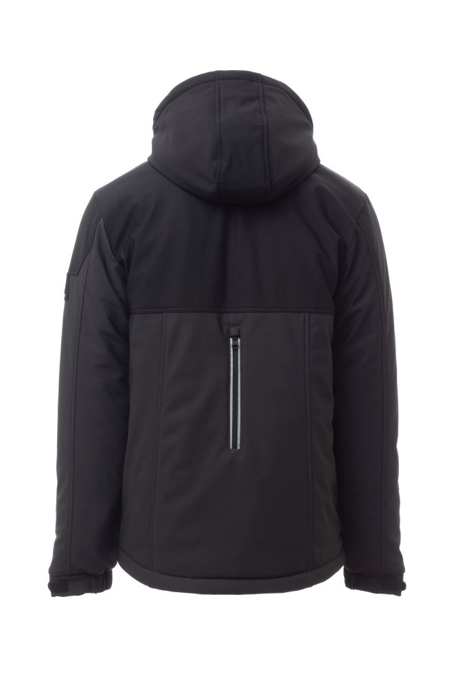 WP 8000 mm H2O, WVT 5000 g/m2 24h. Men’s padded soft-shell, SBS zip closure with "semi-auto lock" metal slider and customised pull. Adjustable and detachable hood with drawstring. Front retroreflective strip on chest. Elasticated cuffs, adjustable with Velcro and inner cuff. Two side pockets with zip and a breast pocket with zip with retroreflective detail. “Life-saving" element on the back, with internal retroreflective logo, closed with zip. Two internal pockets: one right shaped breast pocket with zip and one tablet holder pocket closed with Velcro. Adjustable bottom with customised stoppers.