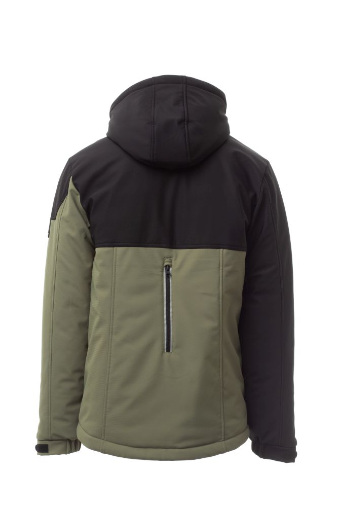 WP 8000 mm H2O, WVT 5000 g/m2 24h. Men’s padded soft-shell, SBS zip closure with "semi-auto lock" metal slider and customised pull. Adjustable and detachable hood with drawstring. Front retroreflective strip on chest. Elasticated cuffs, adjustable with Velcro and inner cuff. Two side pockets with zip and a breast pocket with zip with retroreflective detail. “Life-saving" element on the back, with internal retroreflective logo, closed with zip. Two internal pockets: one right shaped breast pocket with zip and one tablet holder pocket closed with Velcro. Adjustable bottom with customised stoppers.