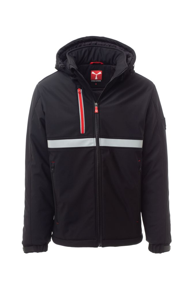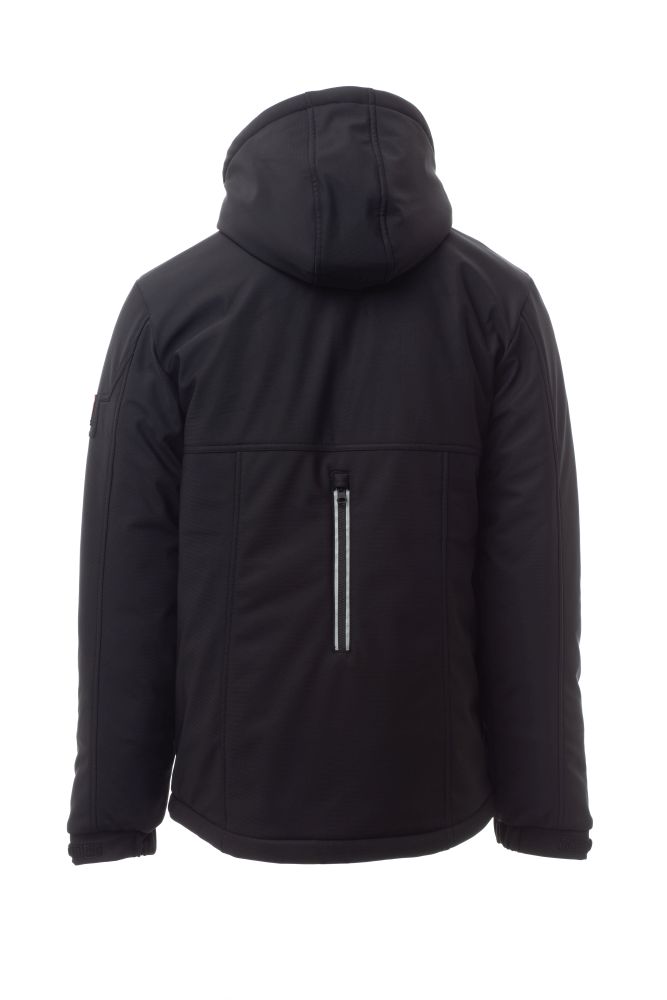 WP 8000 mm H2O, WVT 5000 g/m2 24h. Men’s padded soft-shell, SBS zip closure with "semi-auto lock" metal slider and customised pull. Adjustable and detachable hood with drawstring. Front retroreflective strip on chest. Elasticated cuffs, adjustable with Velcro and inner cuff. Two side pockets with zip and a breast pocket with zip with retroreflective detail. “Life-saving" element on the back, with internal retroreflective logo, closed with zip. Two internal pockets: one right shaped breast pocket with zip and one tablet holder pocket closed with Velcro. Adjustable bottom with customised stoppers.