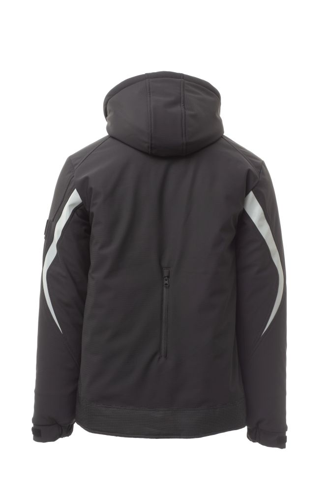 WP 8000 mm H2O, WVT 5000 g/m2 24h. Men’s padded soft-shell, SBS zip closure with "semi-auto lock" metal slider and customised pull. Adjustable and detachable hood with drawstring. Retroreflective strip on shoulders and arms. Elasticated cuffs, adjustable with Velcro and inner cuff. Lock System breast pocket with flap, badge holder and pen holder. Two side pockets closed with a coated tape zip. “Life-saving" element on the back, with internal retroreflective logo, closed with coated zip. Two internal pockets, one tablet holder pocket closed with Velcro and one shaped breast pocket with zip on the right. Adjustable bottom with customised stoppers. Dotted fabric with retroreflective effect.
