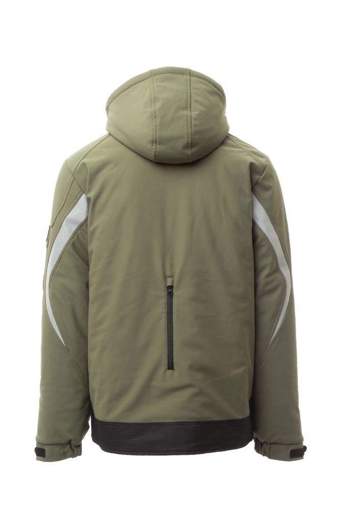 WP 8000 mm H2O, WVT 5000 g/m2 24h. Men’s padded soft-shell, SBS zip closure with "semi-auto lock" metal slider and customised pull. Adjustable and detachable hood with drawstring. Retroreflective strip on shoulders and arms. Elasticated cuffs, adjustable with Velcro and inner cuff. Lock System breast pocket with flap, badge holder and pen holder. Two side pockets closed with a coated tape zip. “Life-saving" element on the back, with internal retroreflective logo, closed with coated zip. Two internal pockets, one tablet holder pocket closed with Velcro and one shaped breast pocket with zip on the right. Adjustable bottom with customised stoppers. Dotted fabric with retroreflective effect.