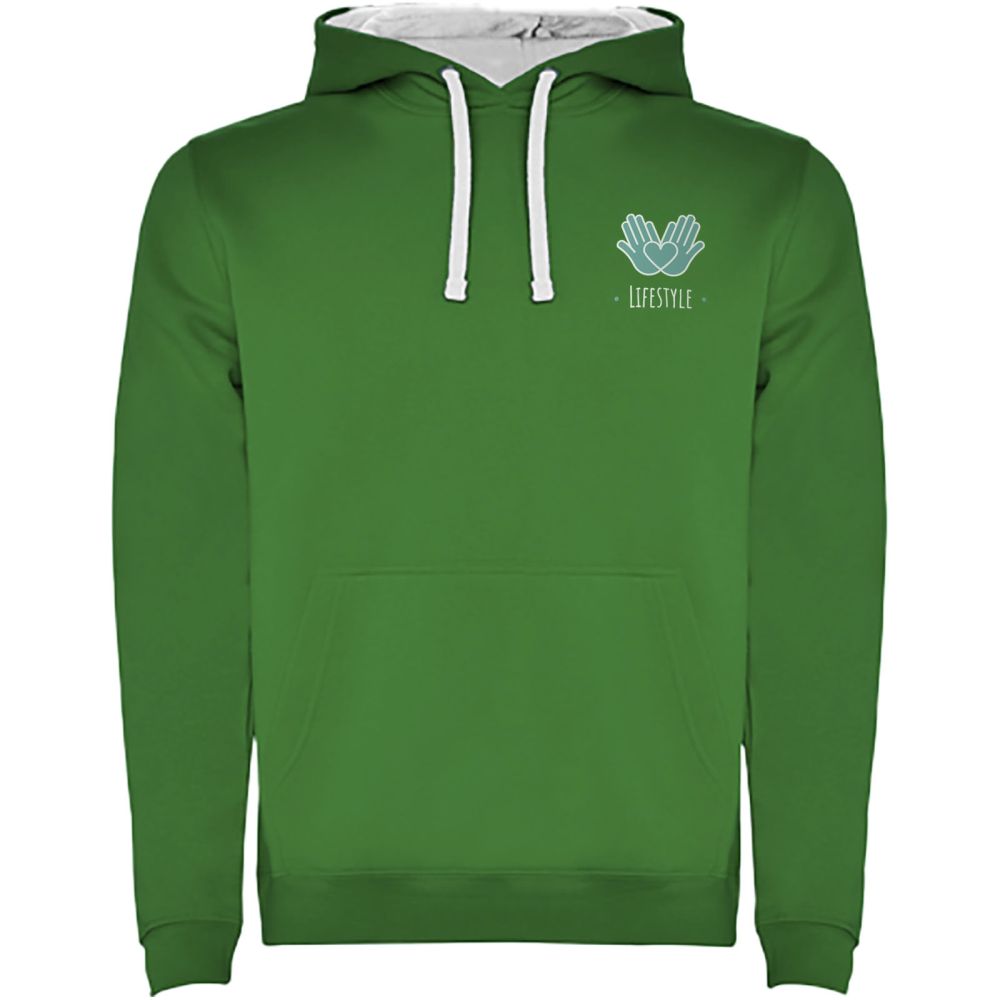 Two-colour hoodie with double fabric, contrasting adjustable drawcord, reinforced covered seams in collar and kangaroo style pocket. 1x1 elastane rib in cuffs and waistband. Removable label. The model is 185 cm and is wearing size M.
