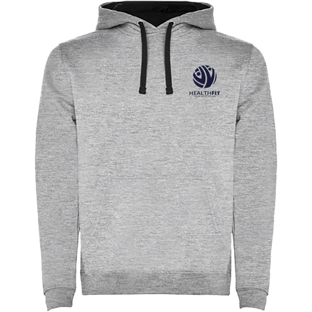 Two-colour hoodie with double fabric, contrasting adjustable drawcord, reinforced covered seams in collar and kangaroo style pocket. 1x1 elastane rib in cuffs and waistband. Removable label. The model is 185 cm and is wearing size M.