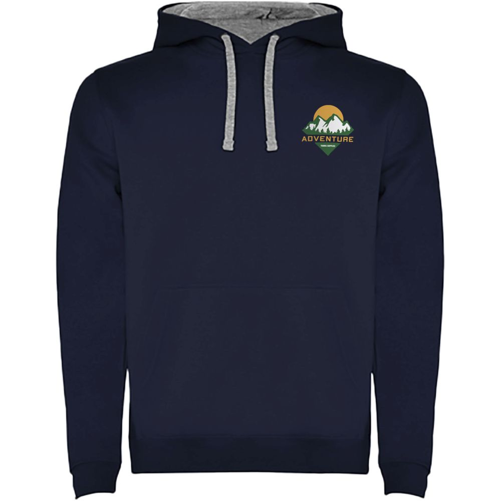 Two-colour hoodie with double fabric, contrasting adjustable drawcord, reinforced covered seams in collar and kangaroo style pocket. 1x1 elastane rib in cuffs and waistband. Removable label. The model is 185 cm and is wearing size M.