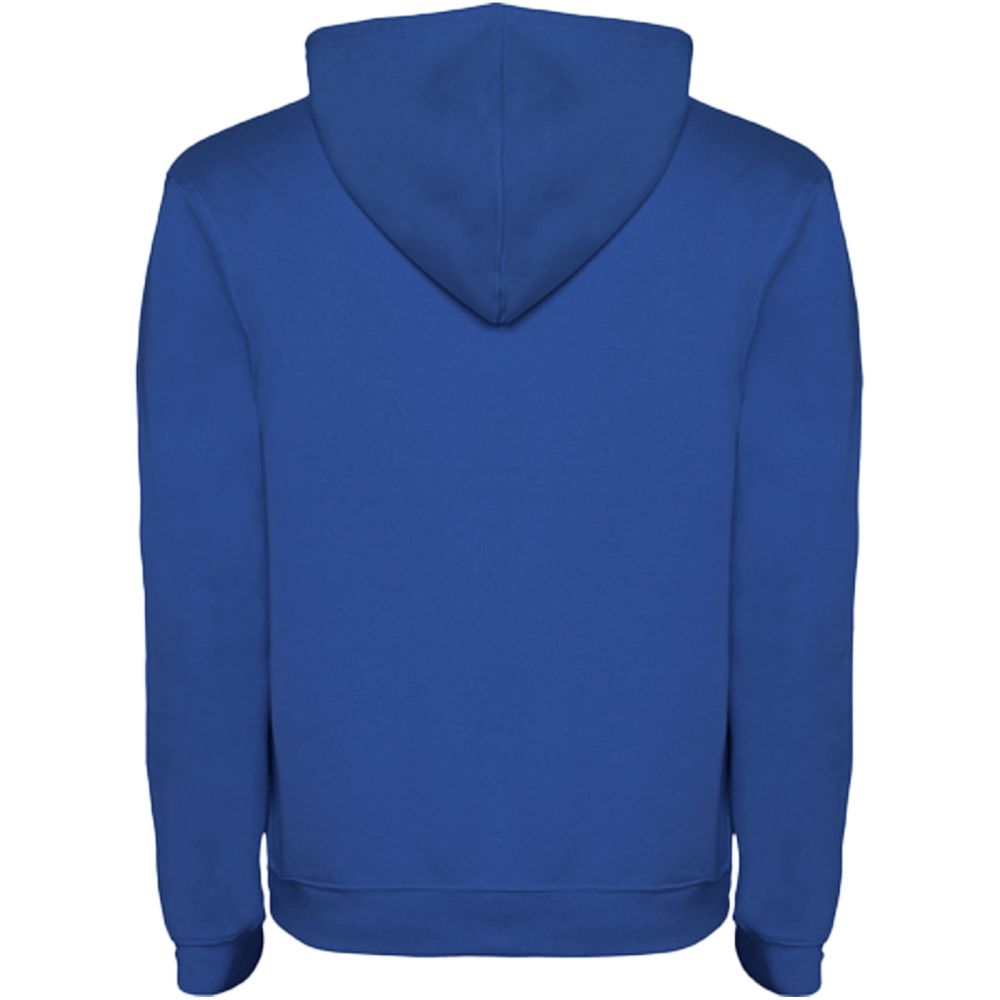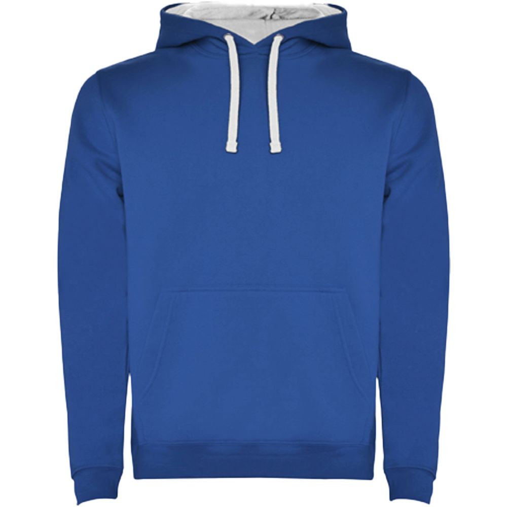Two-colour hoodie with double fabric, contrasting adjustable drawcord, reinforced covered seams in collar and kangaroo style pocket. 1x1 elastane rib in cuffs and waistband. Removable label. The model is 185 cm and is wearing size M.