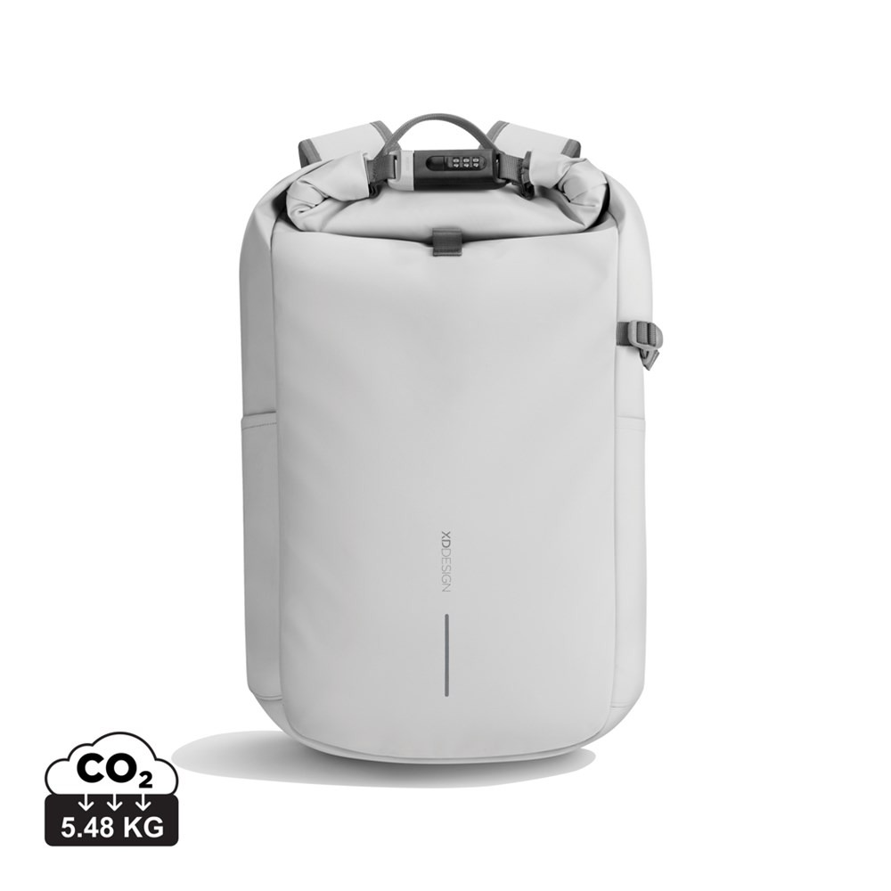 The new Urban anti-theft backpack stands as the ideal travel companion, ensuring security and convenience. By rolling up the main compartment and securing it with the reinforced combination lock, the backpack offers complete closure, which can also be used to lock the bag around a fixed object. Hidden pockets on the back. The bag is equipped with a side water bottle pocket. Internally, padded compartments cater to a 16” laptop and mesh pockets provide organisation for your essentials. Crafted with Aware™ traceable recycled polyester and finished with a soft touch water resistant PU coating. 11% recycled content. Registered design®