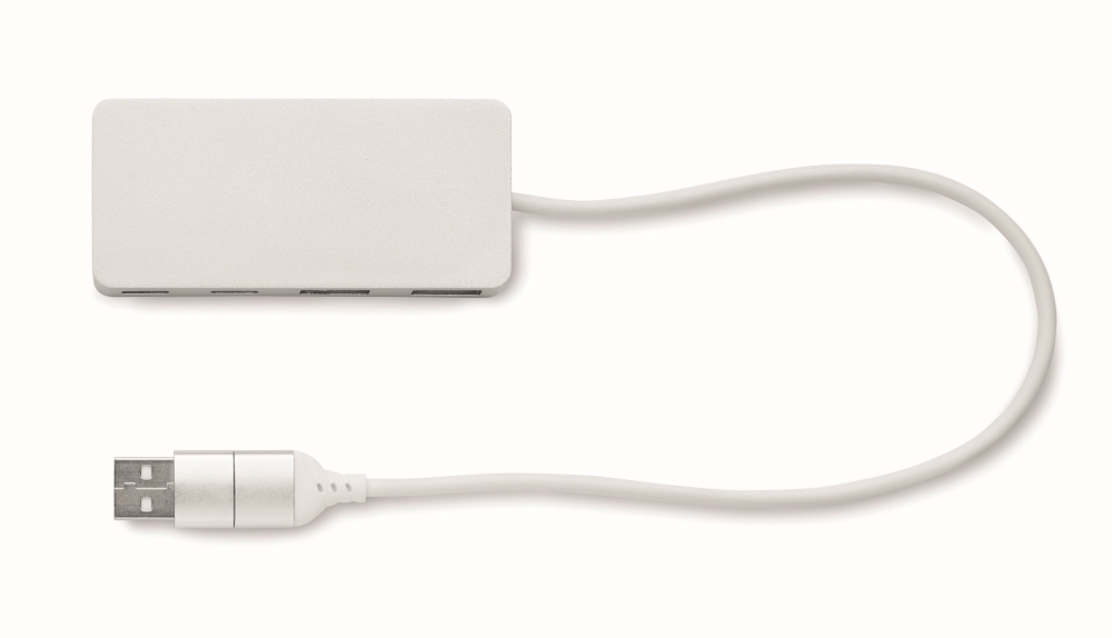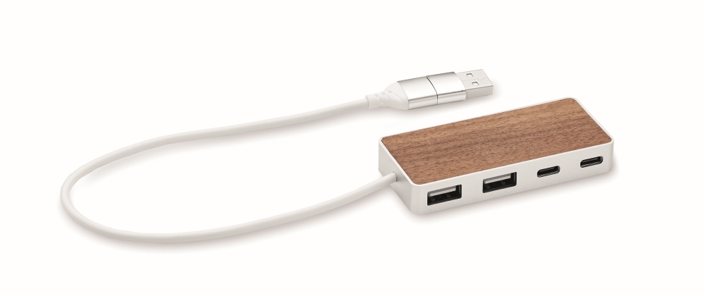 4 port USB hub in recycled aluminium case and walnut top detail. Output: 2 x Type-A and 2 x Type-C. Input: 2-in-1 Type-C and Type-A. Cable length: 27.5 cm. Dimensions: 7,9 x 3,6 x 1,2 cm
