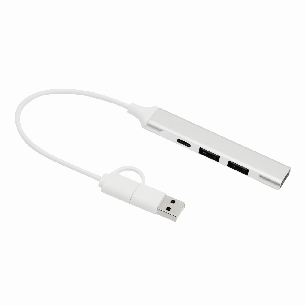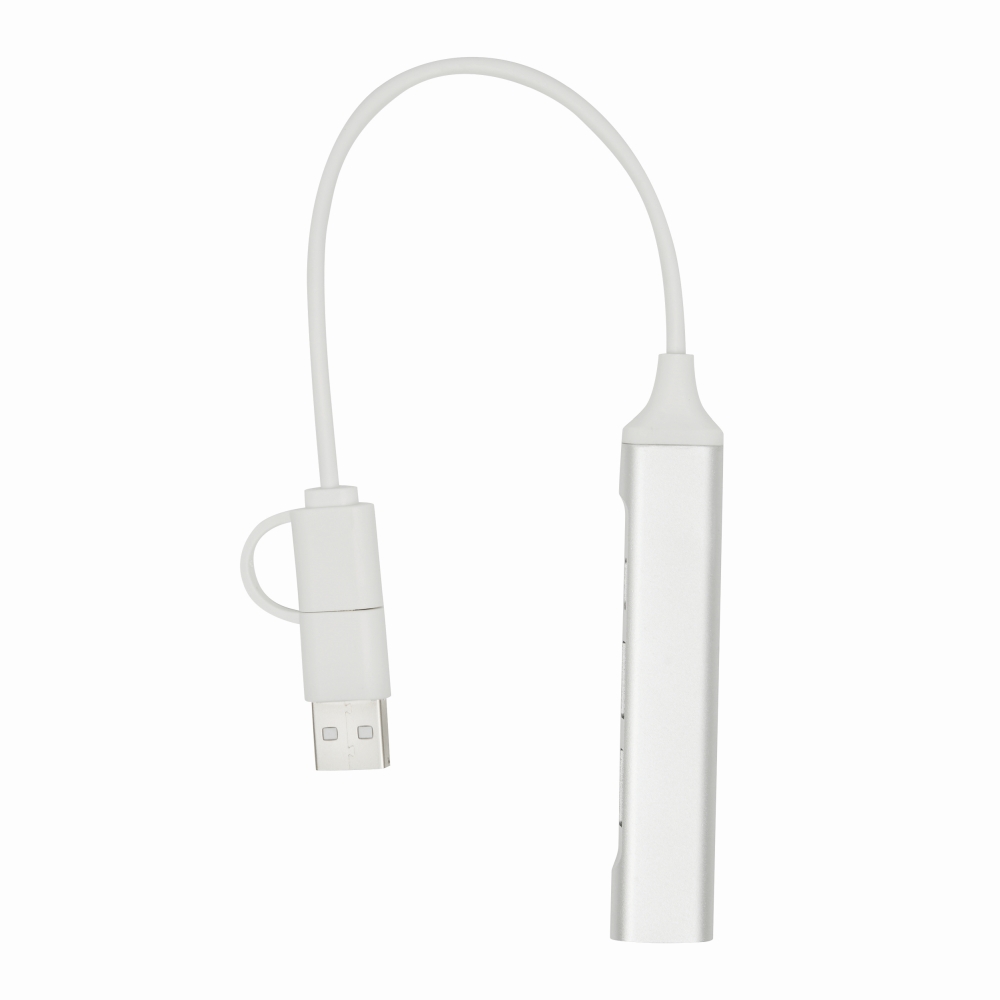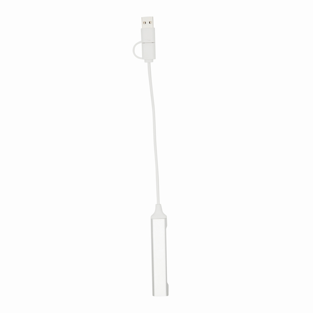 bUSB hub NETWORK/b: in aluminium housing, 2 USB A ports and 1 USB Type-C port, cable length approx. 20 cm, combined USB A / Type-C input plug. Dimensions: 9,5 x 1,6 x 0,7 cm
