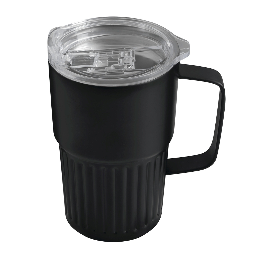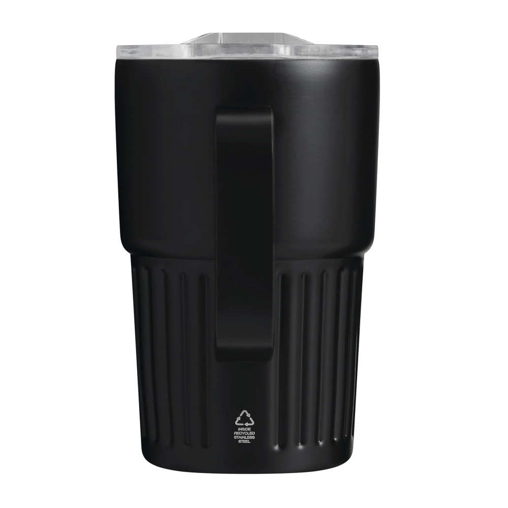 Vacuum drink mug, double-walled: inside made of recycled stainless steel, outside made of stainless steel, practical handle, plastic lid with silicone sealing ring and integrated sliding drinking opening, capacity approx. 450 ml, keeps warm for approx. 4 hours and cold for up to 8 hours, in a box. Dimensions: O8,7 x 14 cm