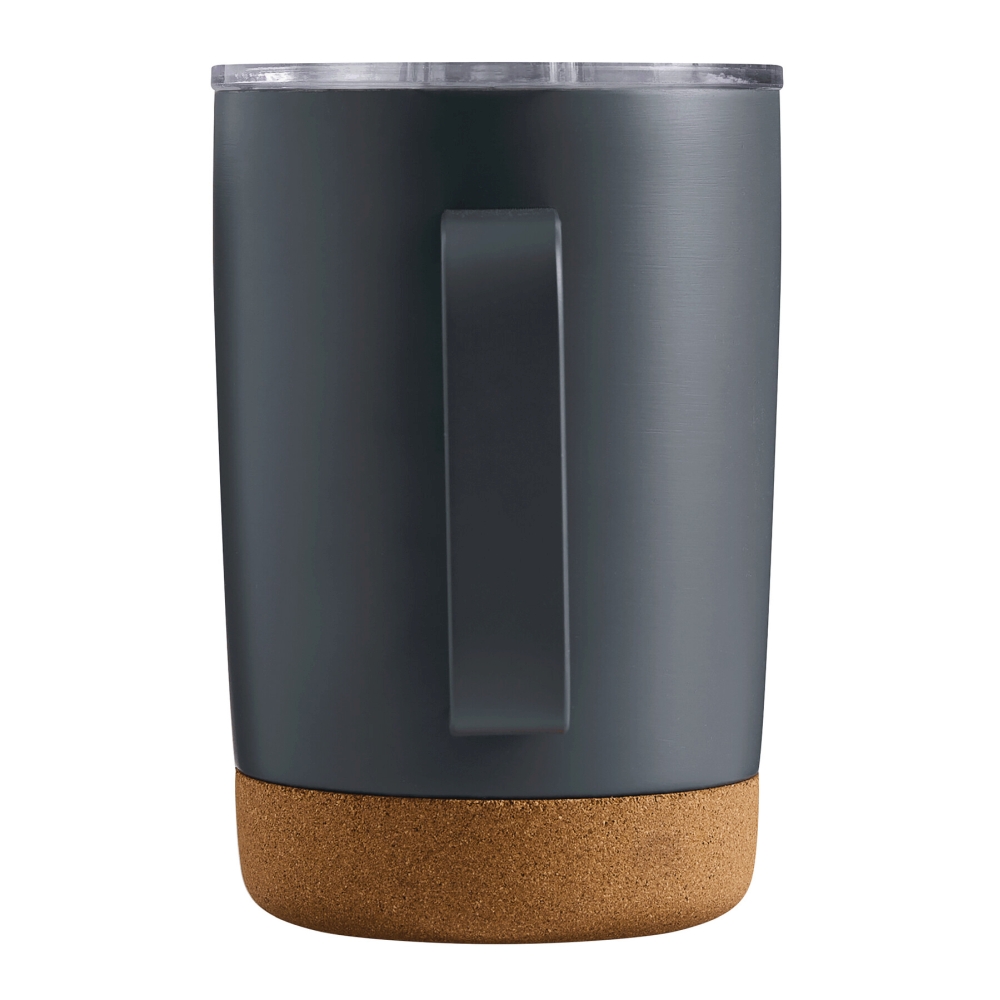 Vacuum drink mug, double-walled: inside and outside made of stainless steel, with cork bottom and practical handle, plastic lid with silicone sealing ring and integrated sliding drinking opening, capacity approx. 350 ml, keeps warm for approx. 4 hours and cold for up to 8 hours, in a box. Dimensions: O8,5 x 13 cm