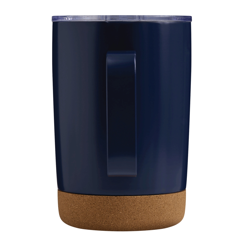 Vacuum drink mug, double-walled: inside and outside made of stainless steel, with cork bottom and practical handle, plastic lid with silicone sealing ring and integrated sliding drinking opening, capacity approx. 350 ml, keeps warm for approx. 4 hours and cold for up to 8 hours, in a box. Dimensions: O8,5 x 13 cm