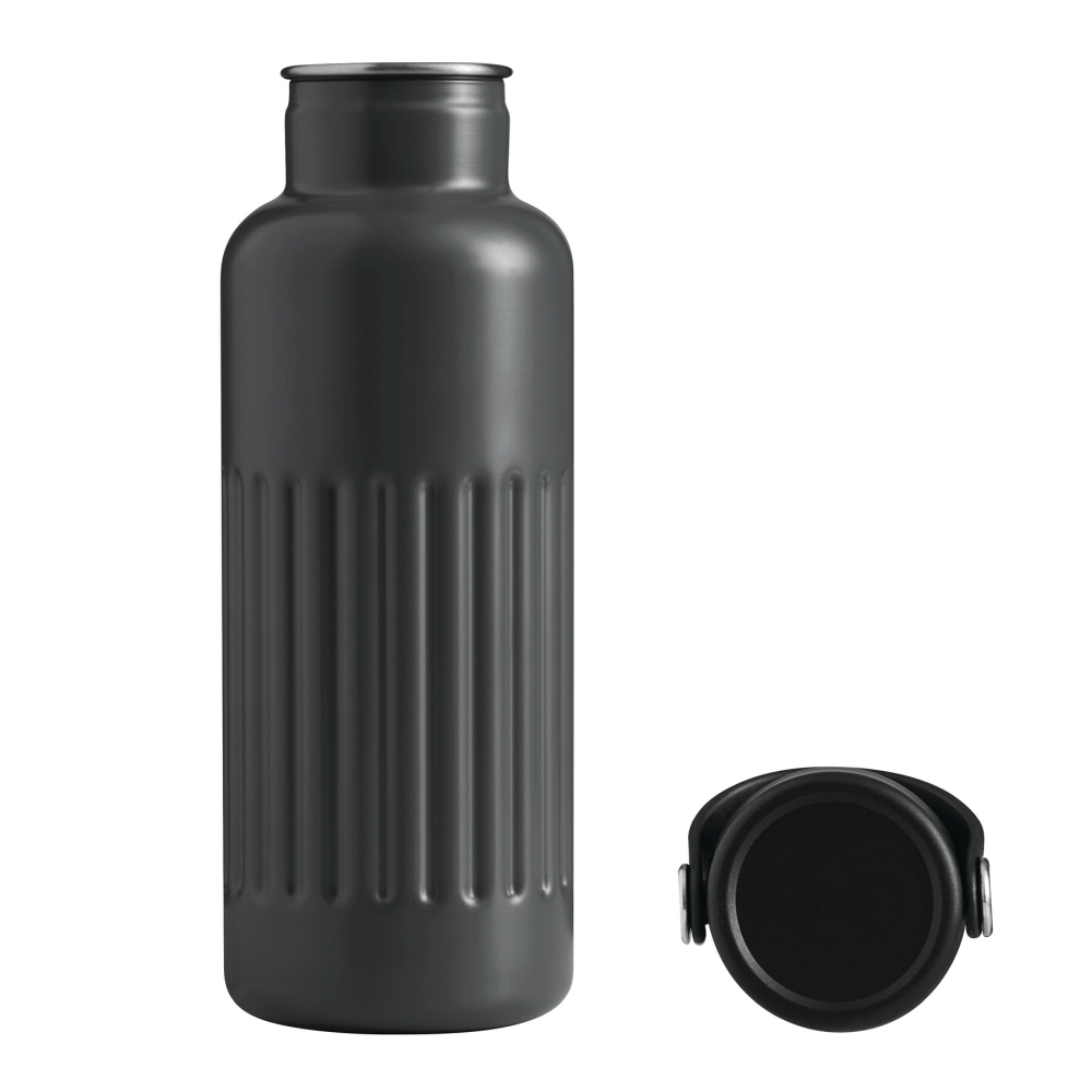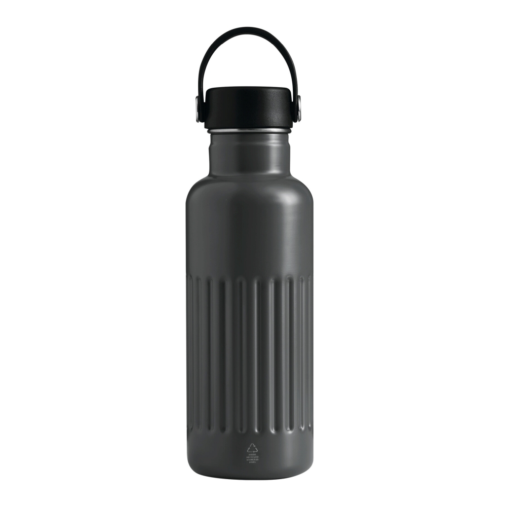 Vacuum drinking bottle, double-walled: inside made of recycled stainless steel, outside made of stainless steel, lid with secure screw cap, silicone sealing ring, and plastic carrying strap, capacity approx. 500 ml, keeps warm for approx. 8 hours and cold for up to 12 hours, in a box. Dimensions: O7 x 22,5 cm