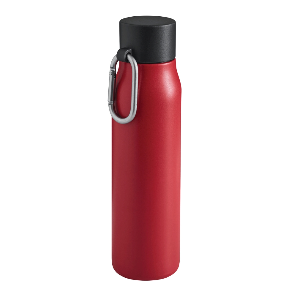 Vacuum drinking bottle, double-walled: inside made of recycled stainless steel, outside made of stainless steel, plastic lid with secure screw cap, silicone sealing ring, and carabiner (the carabiner is NOT suitable for climbing), capacity approx. 550 ml, keeps warm for approx. 8 hours and cold for up to 12 hours, in a box. Dimensions: O6,5 x 25 cm