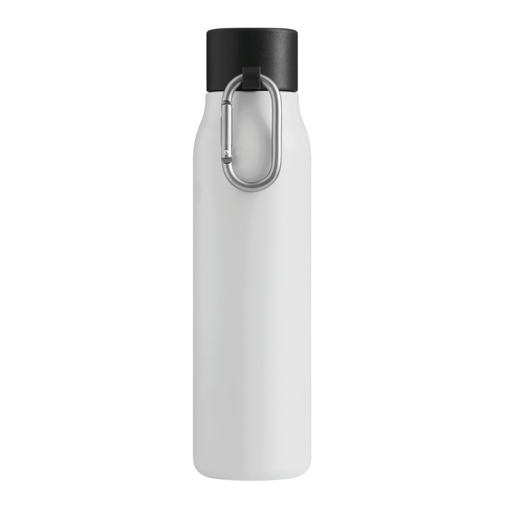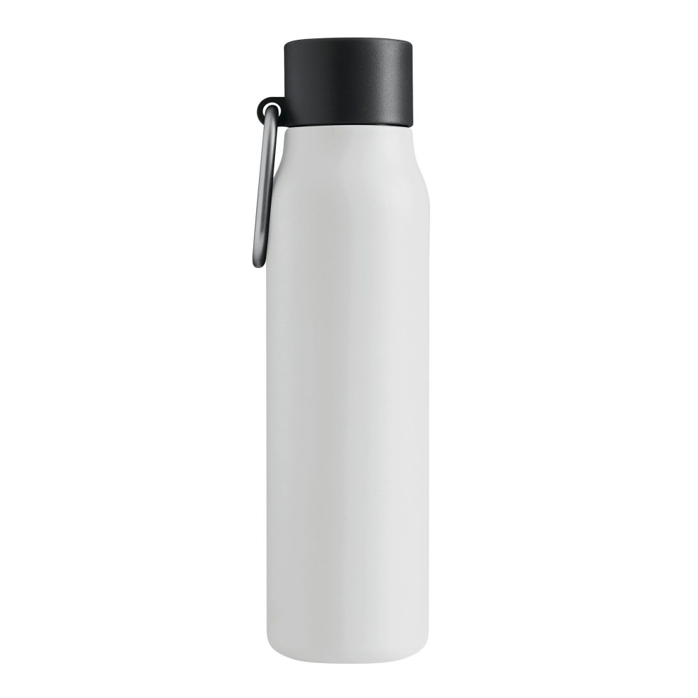Vacuum drinking bottle, double-walled: inside made of recycled stainless steel, outside made of stainless steel, plastic lid with secure screw cap, silicone sealing ring, and carabiner (the carabiner is NOT suitable for climbing), capacity approx. 550 ml, keeps warm for approx. 8 hours and cold for up to 12 hours, in a box. Dimensions: O6,5 x 25 cm