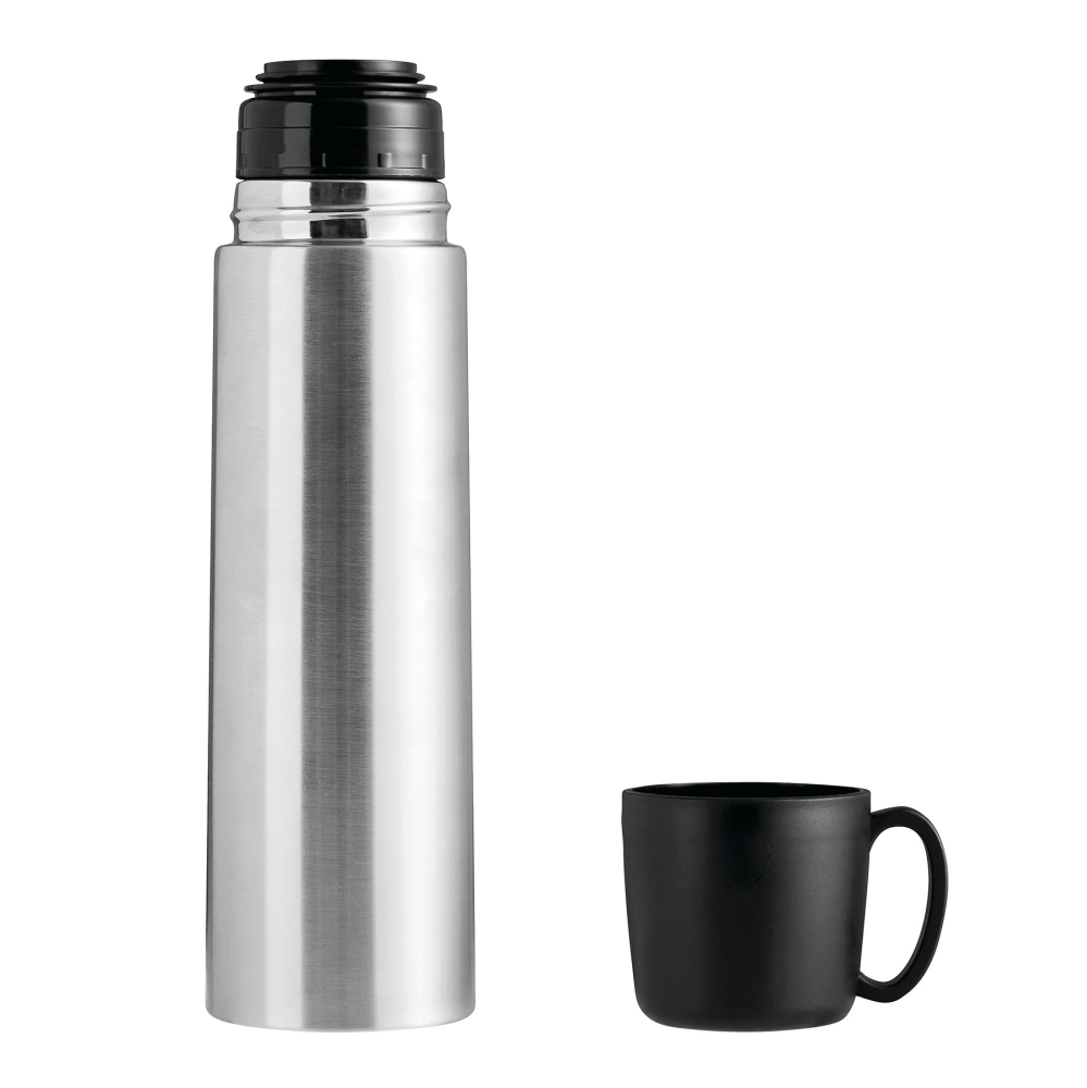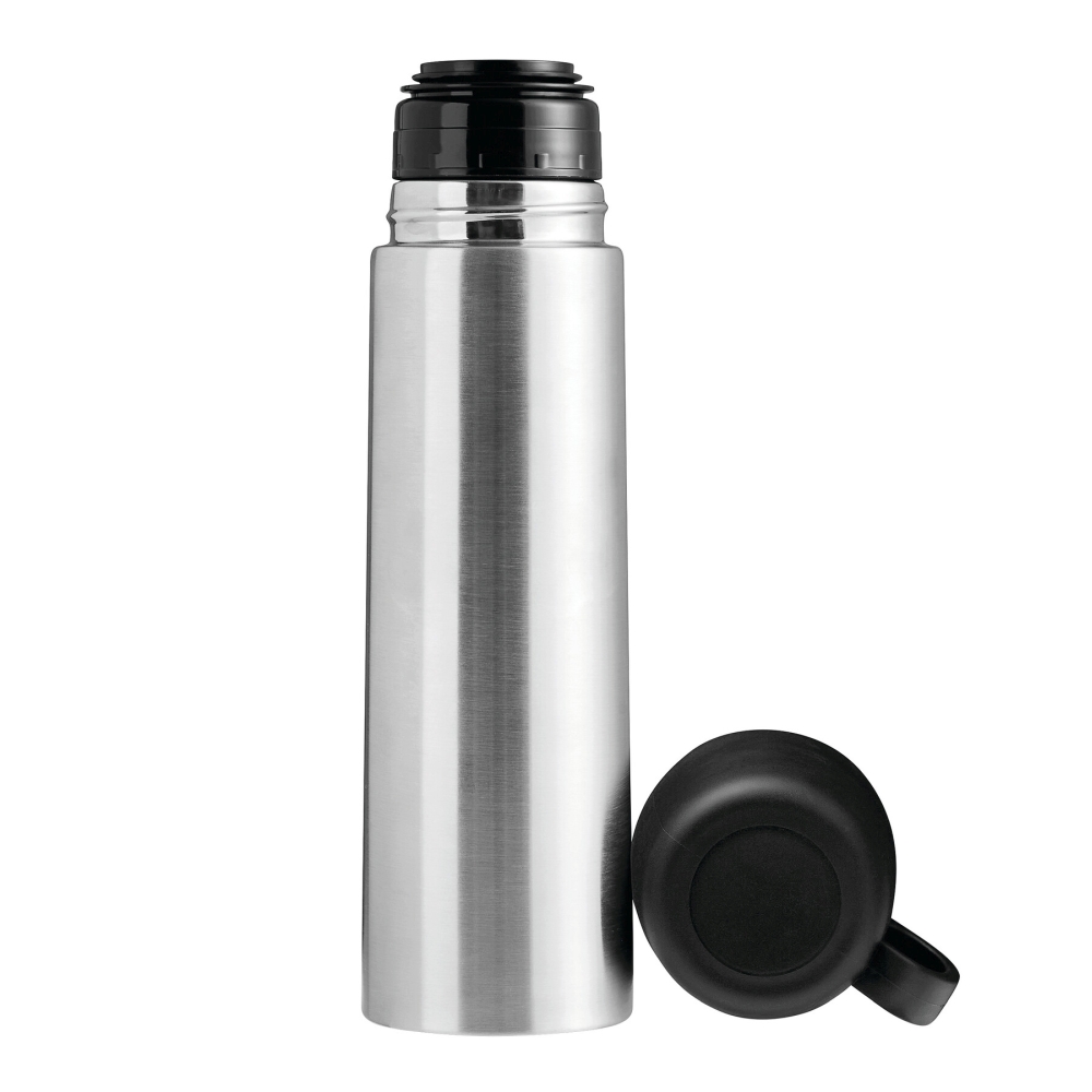 Vacuum flask, double-walled: inside and outside made of stainless steel, lid with secure screw cap and handle (can be used as a mug), plastic spout with push button, and silicone sealing ring, capacity approx. 500 ml, keeps warm for approx. 8 hours and cold for up to 12 hours, in a box. Dimensions: O7 x 25 cm