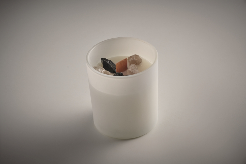 Vanilla fragranced plant based wax candle in glass with stones and wooden wick. 200 gr. Burn time: 20 hours. Dimensions: O 8,2 x 9,2 cm