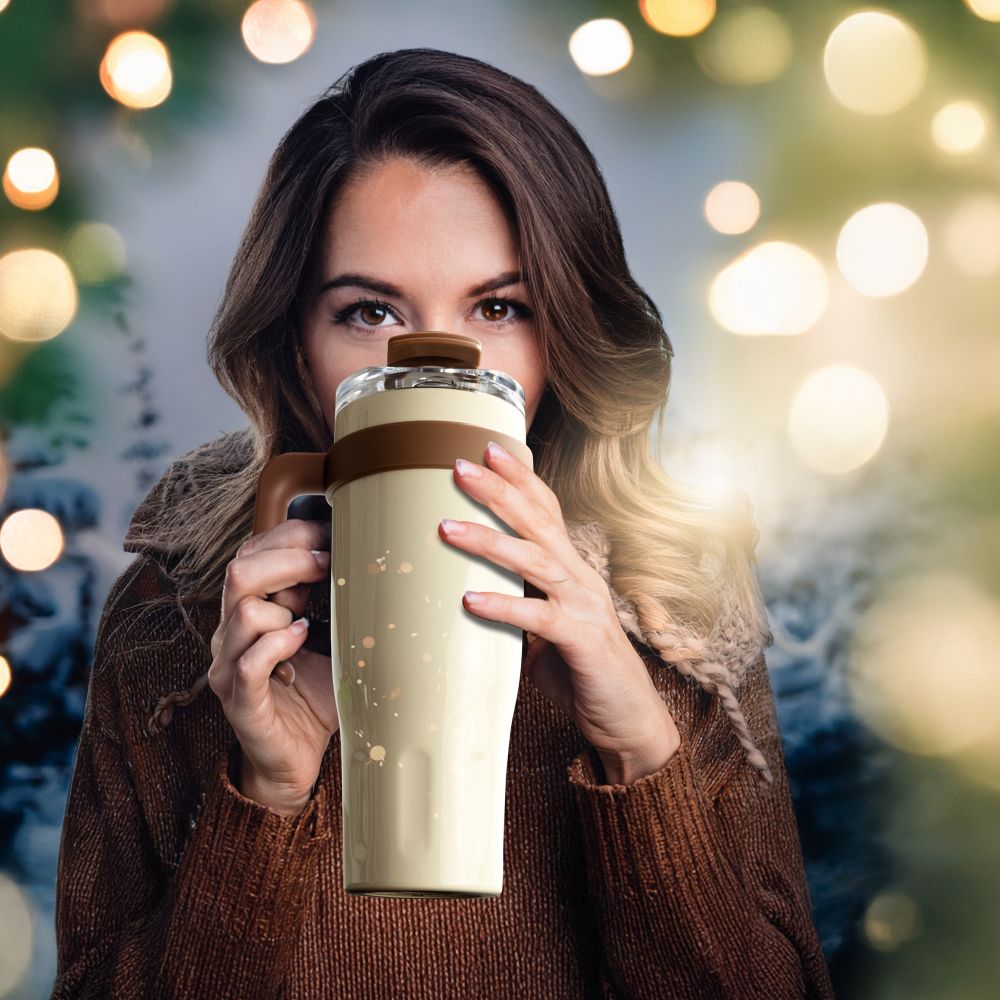 Vanilla Season thermo mug with volume of 1 liter. The mug includes a straw and is made of stainless steel. The mug will maintain the temperature of your cold and hot drink approx. 6 hours. Its a great accessory for car trips, city trips, and the office. It can also be used as a beer mug. Packed in a gift box.
